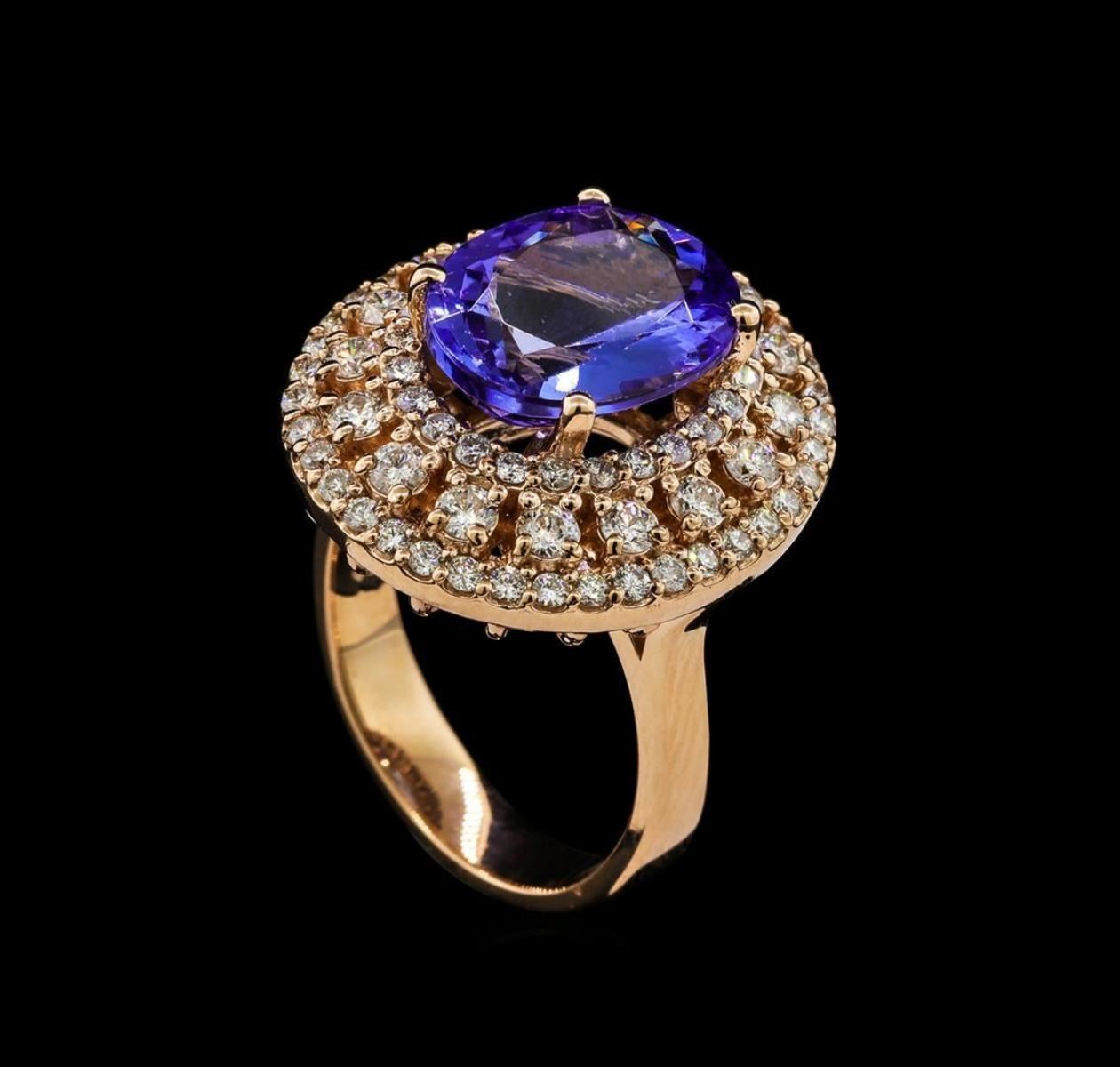 One electronically tested 14KT rose gold lady's cast fashion ring with a triple basket halo with a bright polish finish. The featured lady's ring has a shank measuring 4.04 millimeters wide. Identified with markings of 'K14'. Condition is new, good workmanship. Containing: One prong set oval modified brilliant cut natural tanzanite, measuring 12.69 x 10.32 x 5.62mm, (depth est.) 5%. bulge factor, approximate weight of 5.50ct., clarity is eye clean, medium, moderately strong, bluish violet color, (GIA bV 5/4), cut is good. Transmitting light with no distortion, transparent. Colored gemstones are presumed to have been subjected to commonly used enhancement processes. Graded in the setting. Sixteen prong set round brilliant cut diamonds, measuring 2.30 - 2.20 x 1.37mm (depth est.) approximate total weight of 16 Stones = 0.68ct. Graded in the setting. Clarity SI-1 to I-1. Color: H - I Cut Good Sixty-Two prong set round brilliant cut diamonds, measuring 1.50 - 1.40 x 0.90mm (depth est.) approximate total weight of 62 Stones = 0.72ct. Graded in the setting. Clarity SI-1 to I-1. Color: H - I Cut Good. Total Weight of Colored Stones 5.50ct.. Total Weight of Diamonds 1.40ct.. Total Weight of Ring 10.80gm GAS Appraised.