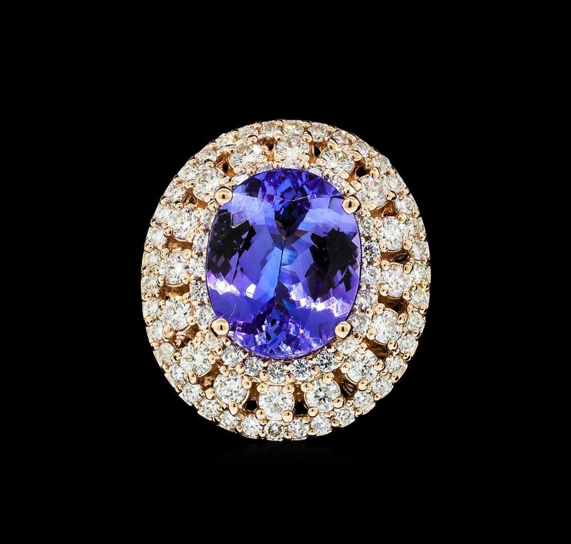 One electronically tested 14KT rose gold lady's cast fashion ring with a triple basket halo with a bright polish finish. The featured lady's ring has a shank measuring 4.04 millimeters wide. Identified with markings of 'K14'. Condition is new, good workmanship. Containing: One prong set oval modified brilliant cut natural tanzanite, measuring 12.69 x 10.32 x 5.62mm, (depth est.) 5%. bulge factor, approximate weight of 5.50 ct., clarity is eye clean, medium, moderately strong, bluish violet color, (GIA bV 5/4), cut is good. Transmitting light with no distortion, transparent. Colored gemstones are presumed to have been subjected to commonly used enhancement processes. Graded in the setting. Sixteen prong set round brilliant cut diamonds, measuring 2.30 - 2.20 x 1.37mm (depth est.) approximate total weight of 16 Stones = 0.68ct. Graded in the setting. Clarity SI-1 to I-1. Color: H - I Cut Good Sixty-Two prong set round brilliant cut diamonds, measuring 1.50 - 1.40 x 0.90mm (depth est.) approximate total weight of 62 Stones = 0.72ct. Graded in the setting. Clarity SI-1 to I-1. Color: H - I Cut Good. Total Weight of Colored Stones 5.50 ct.. Total Weight of Diamonds 1.40 ct.. Total Weight of Ring 10.80gm GAS Appraised.