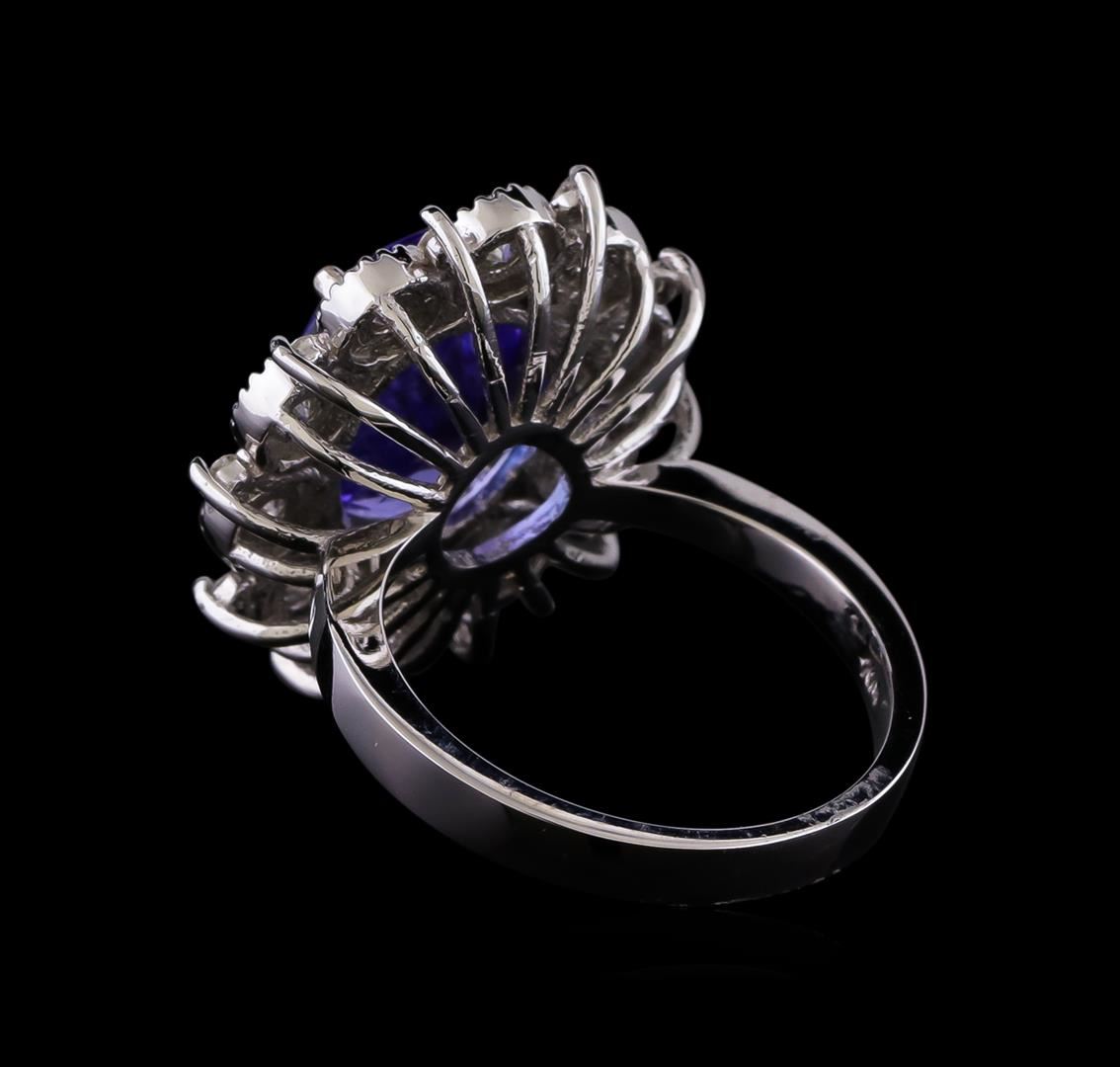 One electronically tested 14KT white gold lady's cast fashion ring with a double basket halo with a bright polish with milgrain detailing finish. The featured lady's has a shank measuring 2.78 millimeters in width. Identified with markings of "K14". Condition is new, good workmanship. Containing: One prong set oval modified brilliant cut natural tanzanite, measuring 12.36 x 9.87 x 5.85mm, (depth est.) 5%. bulge factor, approximate weight of 5.50ct., clarity is eye clean, medium, moderately strong, bluish violet color, (GIA bV 5/4), cut is very good. Transmitting light with no distortion, transparent. Colored gemstones are presumed to have been subjected to commonly used enhancement processes. Graded in the setting. Ten prong set round brilliant cut diamonds, measuring 2.60 - 2.50 x 1.56mm (depth est.) approximate total weight of 10 Stones = 0.62ct. Graded in the setting. Clarity: SI-1 to SI-2. Color: H - I. Cut Good Ten prong set round brilliant cut diamonds, measuring 1.45 - 1.40 x 0.88mm (depth est.) approximate total weight of 10 Stones = 0.12ct. Graded in the setting. Clarity: SI-1 to SI-2. Color: G - Good. Total Weight of Colored Stones 5.50ct. Total Weight of Diamonds 0.74ct. Total Weight of Ring 7.90gm. GAS Appraised.