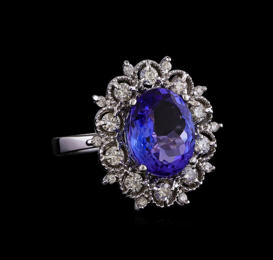 One electronically tested 14KT white gold lady's cast fashion ring with a double basket halo with a bright polish with milgrain detailing finish. The featured lady's has a shank measuring 2.78 millimeters in width. Identified with markings of "K14". Condition is new, good workmanship. Containing: One prong set oval modified brilliant cut natural tanzanite, measuring 12.36 x 9.87 x 5.85mm, (depth est.) 5%. bulge factor, approximate weight of 5.50ct., clarity is eye clean, medium, moderately strong, bluish violet color, (GIA bV 5/4), cut is very good. Transmitting light with no distortion, transparent. Colored gemstones are presumed to have been subjected to commonly used enhancement processes. Graded in the setting. Ten prong set round brilliant cut diamonds, measuring 2.60 - 2.50 x 1.56mm (depth est.) approximate total weight of 10 Stones = 0.62ct. Graded in the setting. Clarity: SI-1 to SI-2. Color: H - I. Cut Good Ten prong set round brilliant cut diamonds, measuring 1.45 - 1.40 x 0.88mm (depth est.) approximate total weight of 10 Stones = 0.12ct. Graded in the setting. Clarity: SI-1 to SI-2. Color: G - Good. Total Weight of Colored Stones 5.50ct. Total Weight of Diamonds 0.74ct. Total Weight of Ring 7.90gm. GAS Appraised.
