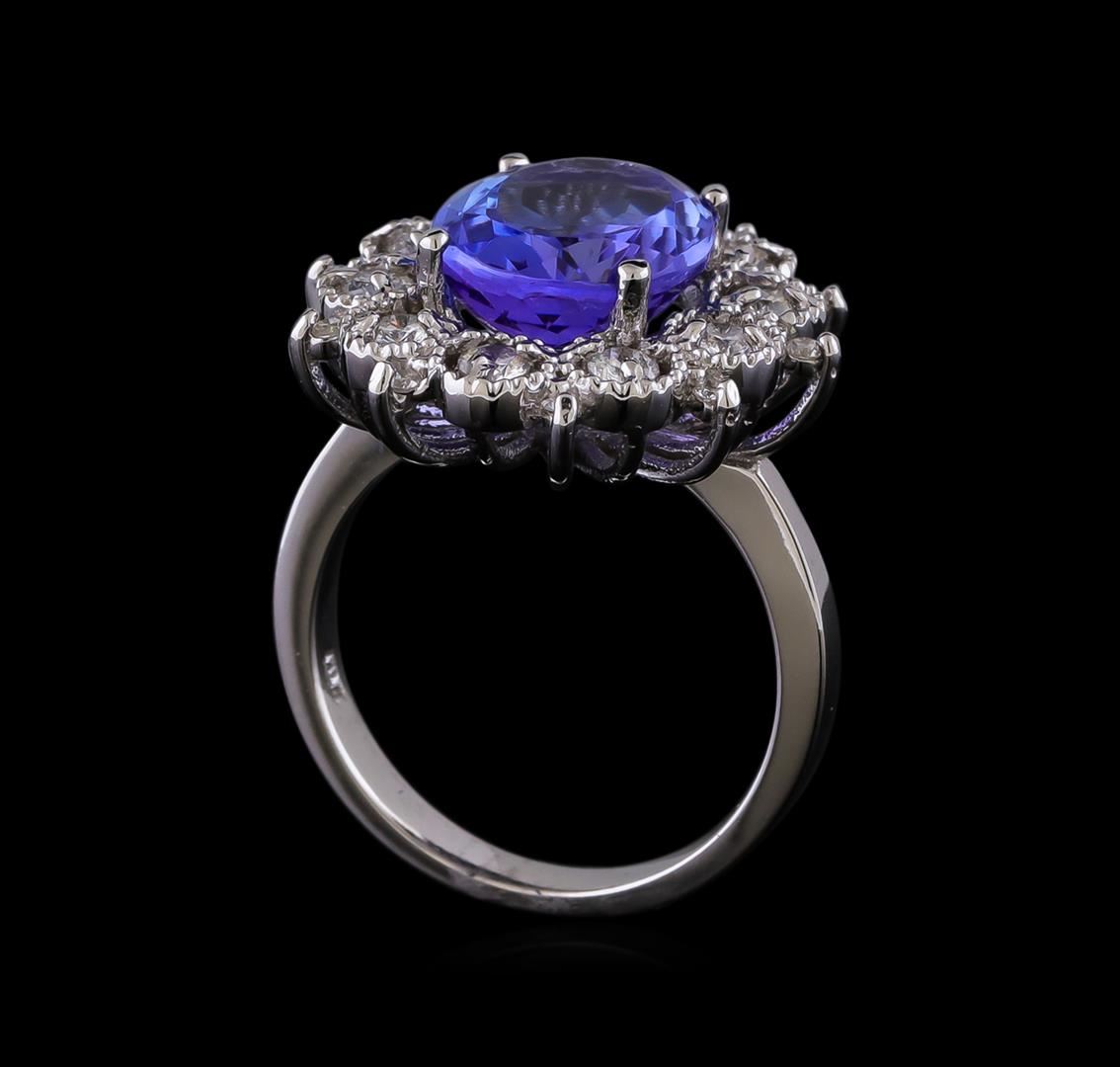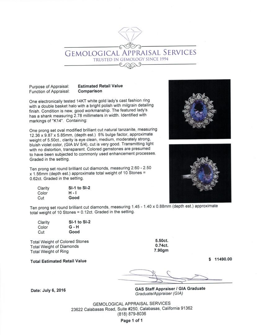 One electronically tested 14KT white gold lady's cast fashion ring with a double basket halo with a bright polish with milgrain detailing finish. The featured lady's has a shank measuring 2.78 millimeters in width. Identified with markings of "K14". Condition is new, good workmanship. Containing: One prong set oval modified brilliant cut natural tanzanite, measuring 12.36 x 9.87 x 5.85mm, (depth est.) 5%. bulge factor, approximate weight of 5.50ct., clarity is eye clean, medium, moderately strong, bluish violet color, (GIA bV 5/4), cut is very good. Transmitting light with no distortion, transparent. Colored gemstones are presumed to have been subjected to commonly used enhancement processes. Graded in the setting. Ten prong set round brilliant cut diamonds, measuring 2.60 - 2.50 x 1.56mm (depth est.) approximate total weight of 10 Stones = 0.62ct. Graded in the setting. Clarity: SI-1 to SI-2. Color: H - I. Cut Good Ten prong set round brilliant cut diamonds, measuring 1.45 - 1.40 x 0.88mm (depth est.) approximate total weight of 10 Stones = 0.12ct. Graded in the setting. Clarity: SI-1 to SI-2. Color: G - Good. Total Weight of Colored Stones 5.50ct. Total Weight of Diamonds 0.74ct. Total Weight of Ring 7.90gm. GAS Appraised.
