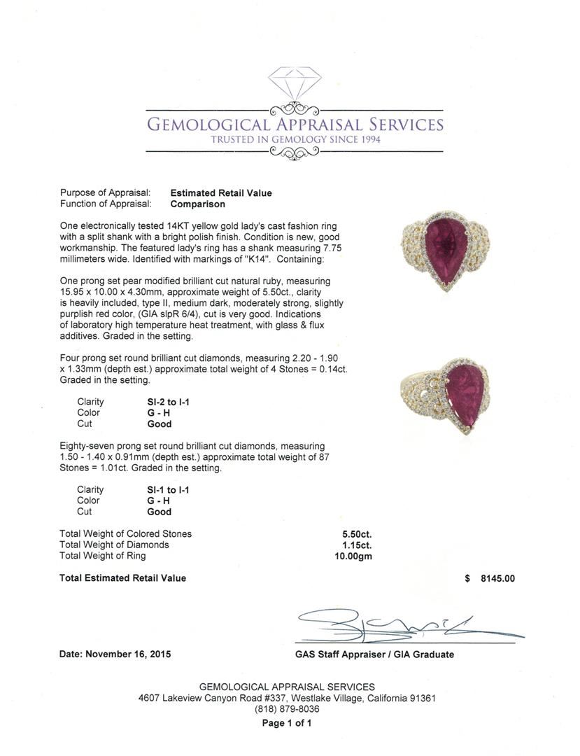 One electronically tested 14KT yellow gold lady's cast fashion ring with a split shank with a bright polish finish. The featured lady's ring has a shank measuring 7.75 millimeters wide. Identified with markings of "K14". Condition is new, good workmanship. Containing: One prong set pear modified brilliant cut natural ruby, measuring 15.95 x 10.00 x 4.30mm, approximate weight of 5.50ct., clarity is heavily included, type II, medium dark, moderately strong, slightly purplish red color, (GIA slpR 6/4), cut is very good. Indications of laboratory high temperature heat treatment, with glass & flux additives. Graded in the setting. Four prong set round brilliant cut diamonds, measuring 2.20 - 1.90 x 1.33mm (depth est.) approximate total weight of 4 Stones = 0.14ct. Graded in the setting. Clarity: SI-2 to I-1. Color: G - H. Cut Good Eighty-Seven prong set round brilliant cut diamonds, measuring 1.50 - 1.40 x 0.91mm (depth est.) approximate total weight of 87 Stones = 1.01ct. Graded in the setting. Clarity: SI-1 to I-1. Color: G - Good. Total Weight of Colored Stones 5.50ct. Total Weight of Diamonds 1.15ct. Total Weight of Ring 10.00gm. GAS Appraised at $8,145.00.