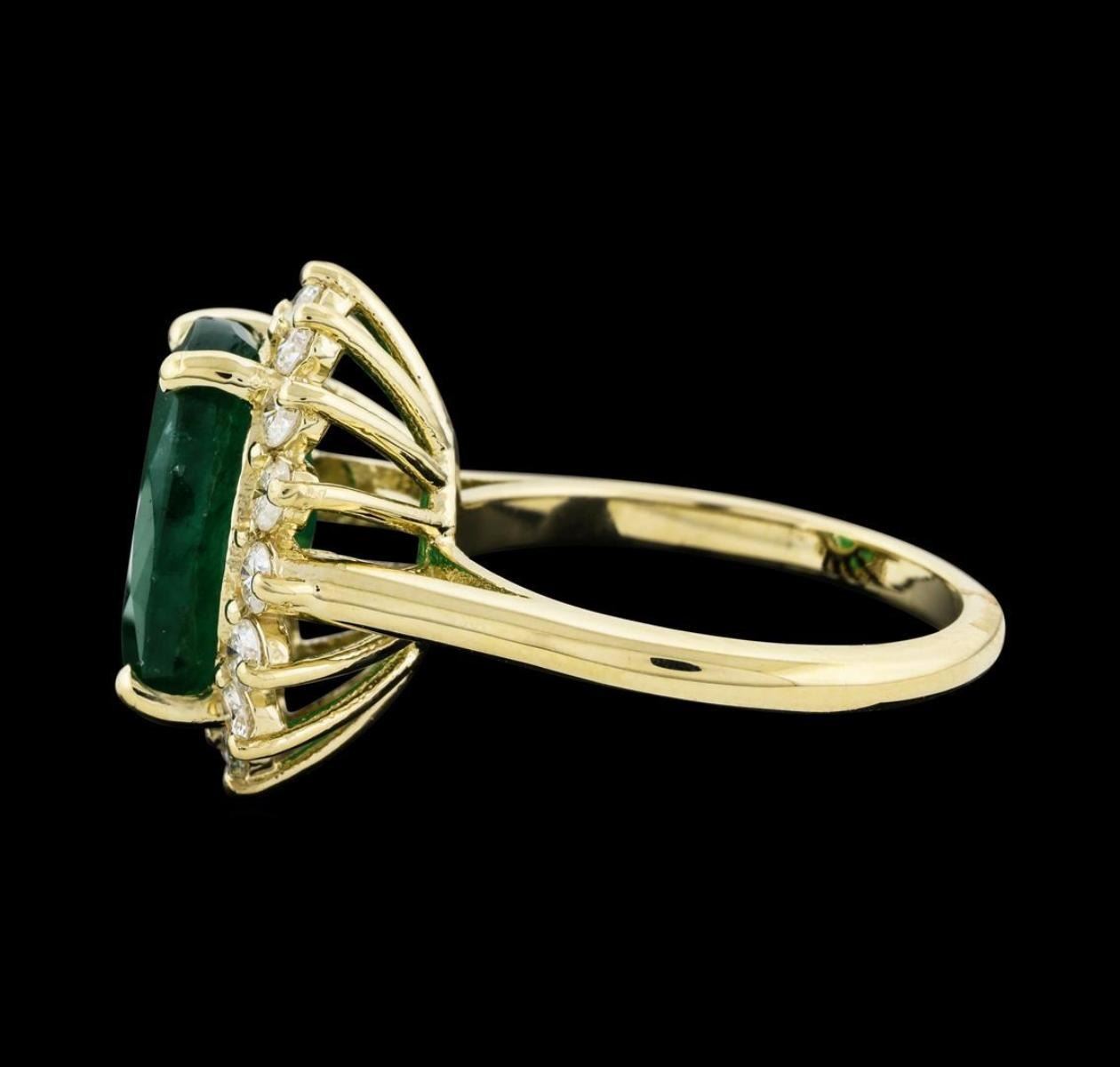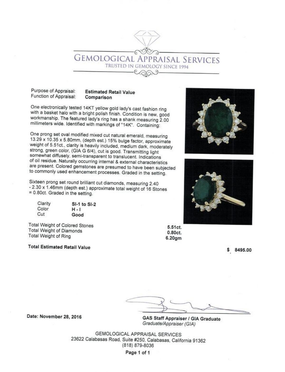 One electronically tested 14KT yellow gold lady's cast fashion ring with a basket halo with a bright polish finish. The featured lady's ring has a shank measuring 2.00 millimeters wide. Identified with markings of '14K'. Condition is new, good workmanship. Containing: One prong set oval modified mixed cut natural emerald, measuring 13.29 x 10.35 x 5.80mm, (depth est.) 15%. bulge factor, approximate weight of 5.51ct., clarity is heavily included, medium dark, moderately strong, green color, (GIA G 6/4), cut is good. Transmitting light somewhat diffusely, semi-transparent to translucent. Indications of oil residue. Naturally occurring internal & external characteristics are present. Colored gemstones are presumed to have been subjected to commonly used enhancement processes. Graded in the setting. Sixteen prong set round brilliant cut diamonds, measuring 2.40 - 2.30 x 1.46mm (depth est.) approximate total weight of 16 Stones = 0.80ct. Graded in the setting. Clarity SI-1 to SI-2. Color: H - I Cut Good. Total Weight of Colored Stones 5.51ct.. Total Weight of Diamonds 0.80ct.. Total Weight of Ring 6.20gm. GAS Appraised.
