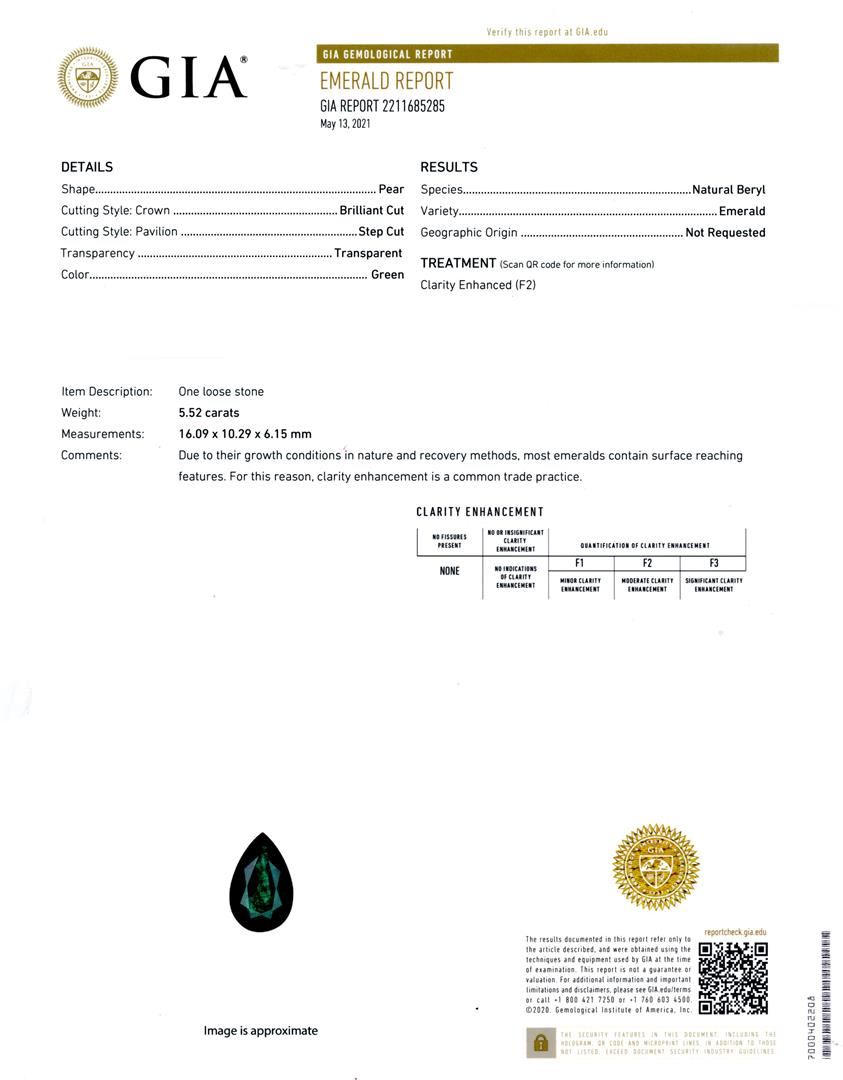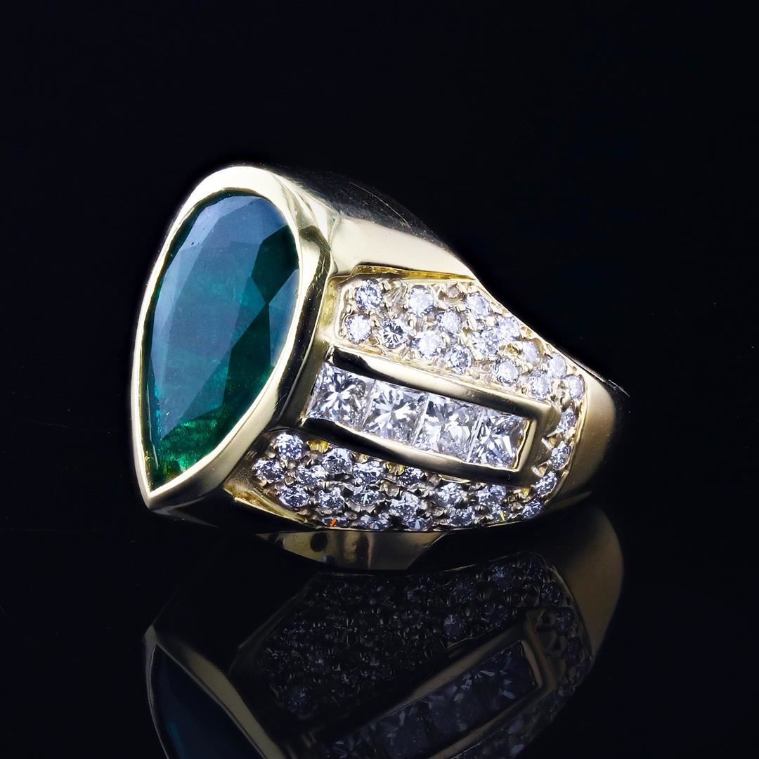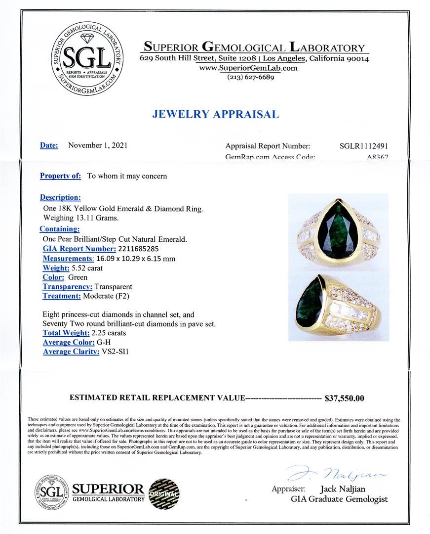 5.52ct Emerald and 2.25ctw Diamond 18K Yellow Gold Ring (GIA CERTIFIED). Description: One 18K Yellow Gold Emerald and Diamond Ring. Weighing 13.11 Grams Containing: One Pear Brilliant/Step Cut Natural Emerald GIA Report Number: 2211685285 Measurements: 16.09 x 10.29 x 6.15mm Weight: 5.52 carat Color: Green Transparency: Transparent Treatment: Moderate (F2) Eight princess-cut diamonds in channel set, and Seventy Two round brilliant-cut diamonds in pave set Total Weight: 2.25 carats Average Color: G-H Average Clarity: VS2-SI1