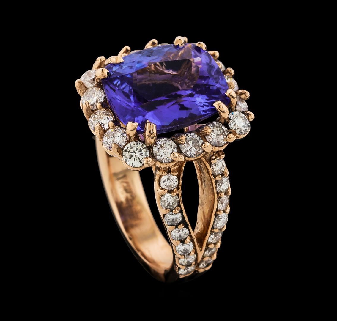 One electronically tested 14KT rose gold lady's cast fashion ring with a split shank basket halo with a bright polish finish. The featured lady's ring has a double shank measuring 3.65 millimeters wide. Identified with markings of '14K'. Condition is new, good workmanship. Containing: One prong set rectangular cushion modified brilliant cut natural tanzanite, measuring 12.15 x 10.05 x 5.95mm, (depth est.) approximate weight of 5.52ct., clarity is eye clean, medium, moderately strong, violetish blue color, (GIA vB 5/4), cut is very good. Transmitting light with no distortion, transparent. Colored gemstones are presumed to have been subjected to commonly used enhancement processes. Graded in the setting. Sixteen prong set round brilliant cut diamonds, measuring 2.60 - 2.50 x 1.58mm (depth est.) approximate total weight of 16 Stones = 1.00ct. Graded in the setting. Clarity SI-1 to I-1. Color: H - I Cut Good Twenty-Eight prong set round brilliant cut diamonds, measuring 1.95 - 1.85 x 1.18mm (depth est.) approximate total weight of 28 Stones = 0.73ct. Graded in the setting. Clarity SI-1 to SI-2. Color: H - I Cut Good. Total Weight of Colored Stones 5.52ct.. Total Weight of Diamonds 1.73ct.. Total Weight of Ring 9.90gm. GAS Appraised at $11,935.00.