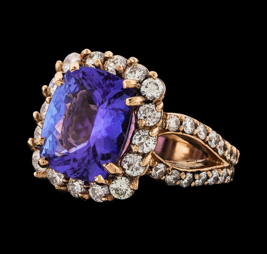 One electronically tested 14KT rose gold lady's cast fashion ring with a split shank basket halo with a bright polish finish. The featured lady's ring has a double shank measuring 3.65 millimeters wide. Identified with markings of '14K'. Condition is new, good workmanship. Containing: One prong set rectangular cushion modified brilliant cut natural tanzanite, measuring 12.15 x 10.05 x 5.95mm, (depth est.) approximate weight of 5.52ct., clarity is eye clean, medium, moderately strong, violetish blue color, (GIA vB 5/4), cut is very good. Transmitting light with no distortion, transparent. Colored gemstones are presumed to have been subjected to commonly used enhancement processes. Graded in the setting. Sixteen prong set round brilliant cut diamonds, measuring 2.60 - 2.50 x 1.58mm (depth est.) approximate total weight of 16 Stones = 1.00ct. Graded in the setting. Clarity SI-1 to I-1. Color: H - I Cut Good Twenty-Eight prong set round brilliant cut diamonds, measuring 1.95 - 1.85 x 1.18mm (depth est.) approximate total weight of 28 Stones = 0.73ct. Graded in the setting. Clarity SI-1 to SI-2. Color: H - I Cut Good. Total Weight of Colored Stones 5.52ct.. Total Weight of Diamonds 1.73ct.. Total Weight of Ring 9.90gm. GAS Appraised at $11,935.00.