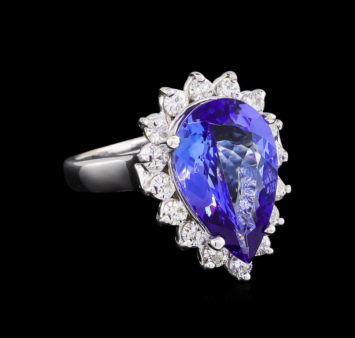 One electronically tested 14KT white gold ladies cast tanzanite and diamond ring with a bright polish finish. The featured tanzanite is set within a diamond floret supported by a ribbed under gallery, completed by a two millimeter wide band. Identified with markings of "14K". Condition is new, good workmanship. Containing: One prong set pear mixed cut natural tanzanite, measuring 15.60 x 10.00 x 5.40mm, approximate weight of 5.52ct., clarity is eye clean, type I, medium dark, very slightly grayish, bluish violet color, (GIA bV 6/3), cut is good. Transmitting light with no distortion, transparent. Colored Stone Grading Report attached. Graded in the setting. Tanzanite is a very rare gemstone that is only found in the country of Tanzania. Originally discovered in 1967. Tiffany & Company, named the stone Tanzanite. It is found in the Usumburu Mountains that border the Umba Valley of northern Tanzania. Tanzanite occurs in gray, brown, violet, blue, reddish-purple, & green. The gem is interesting because of its exceptional pleochroism. Rotated in different directions a tanzanite will exhibit multiple changes of color. Tanzanite has a low tolerance to ultrasonic cleaning, and should not be cleaned using this method. Sixteen prong set round brilliant cut diamonds approximate total weight of 16 Stones = 0.77ct. Clarity grade is an average for the group. Graded in the setting. Clarity: SI-1 to SI-2. Color: D - F. Total Weight of Colored Stones 5.52ct. Total Weight of Diamonds 0.77ct. Total Weight of Ring 7.17gm. AIG Appraised at $15,915.00.