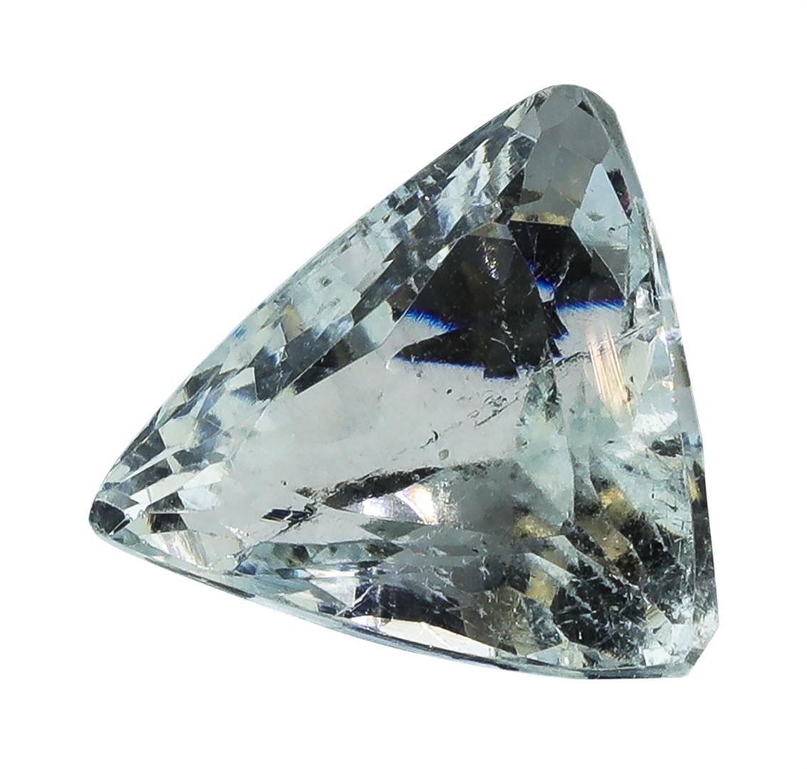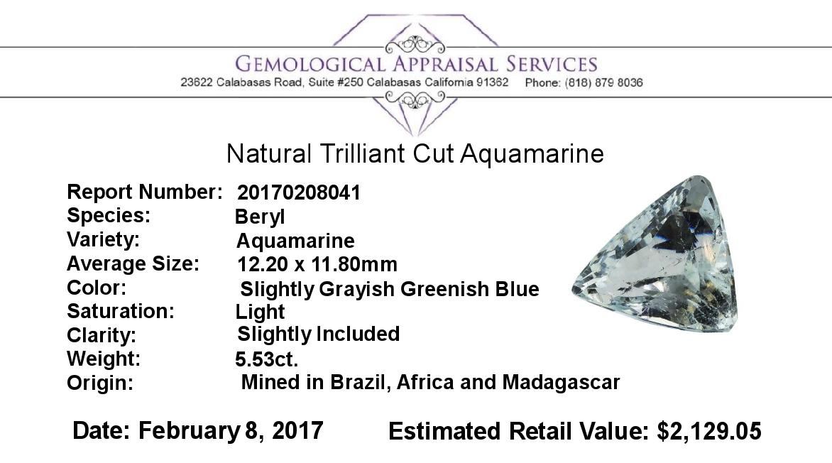 One natural trilliant cut aquamarine with an exact weight of 5.53ct., clarity is slightly included, slightly grayish greenish blue, light. Gemological Appraisals Services estimates the retail value at $2129.05 GAS Appraised.