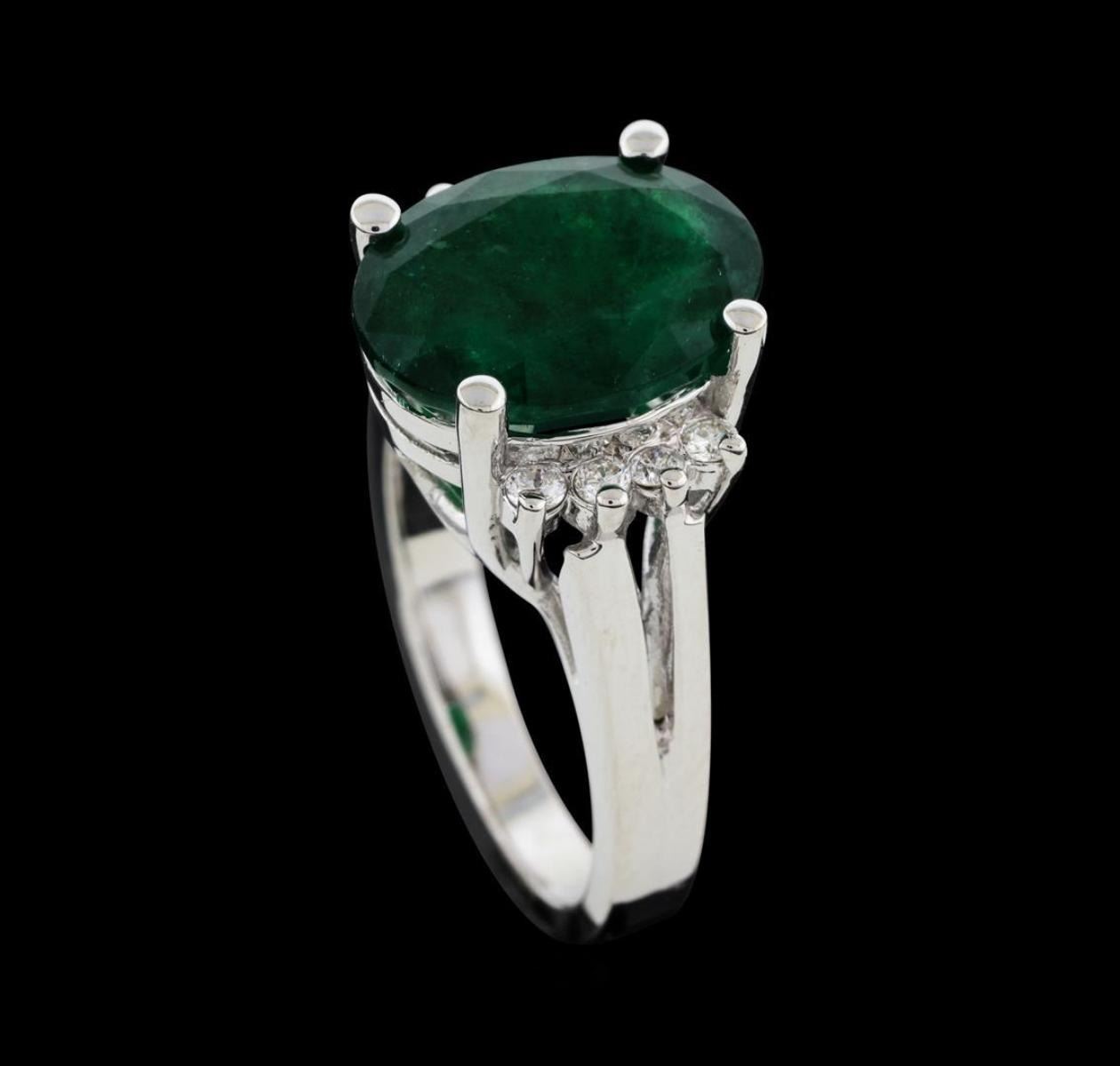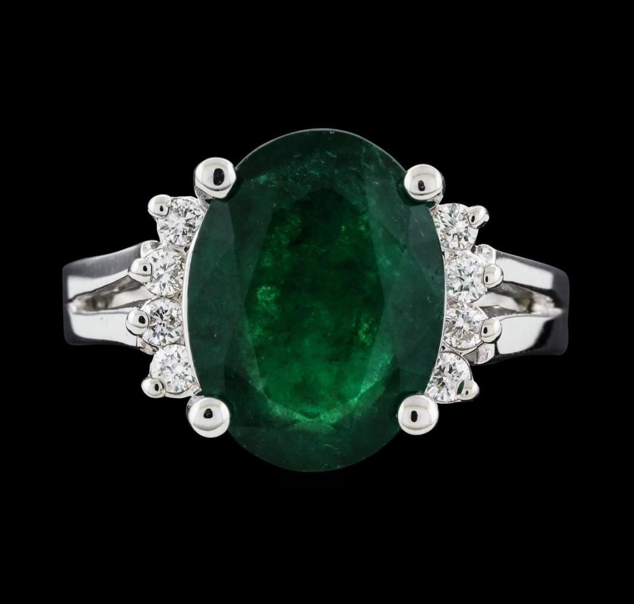 One electronically tested 14KT white gold lady's cast fashion ring with a split cathedral shank with a bright polish finish. The featured lady's ring has diamond set shoulders and a shank measuring 2.66 millimeters wide. Identified with markings of '14K'. Condition is new, good workmanship. Containing: One prong set oval modified mixed cut natural emerald, measuring 13.40 x 10.03 x 5.91mm, (depth est.) 15%. bulge factor, approximate weight of 5.53ct., clarity is heavily included, medium dark, moderately strong, green color, (GIA G 6/4), cut is good. Transmitting light somewhat diffusely, semi-transparent to translucent. Indications of oil residue. Naturally occurring internal & external characteristics are present. Colored gemstones are presumed to have been subjected to commonly used enhancement processes. Graded in the setting. Eight prong set round brilliant cut diamonds, measuring 2.00 - 1.90 x 1.21mm (depth est.) approximate total weight of 8 Stones = 0.23ct. Graded in the setting. Clarity VS-2 to SI-2. Color: G - H Cut Good. Total Weight of Colored Stones 5.53ct.. Total Weight of Diamonds 0.23ct.. Total Weight of Ring 7.20gm. GAS Appraised.