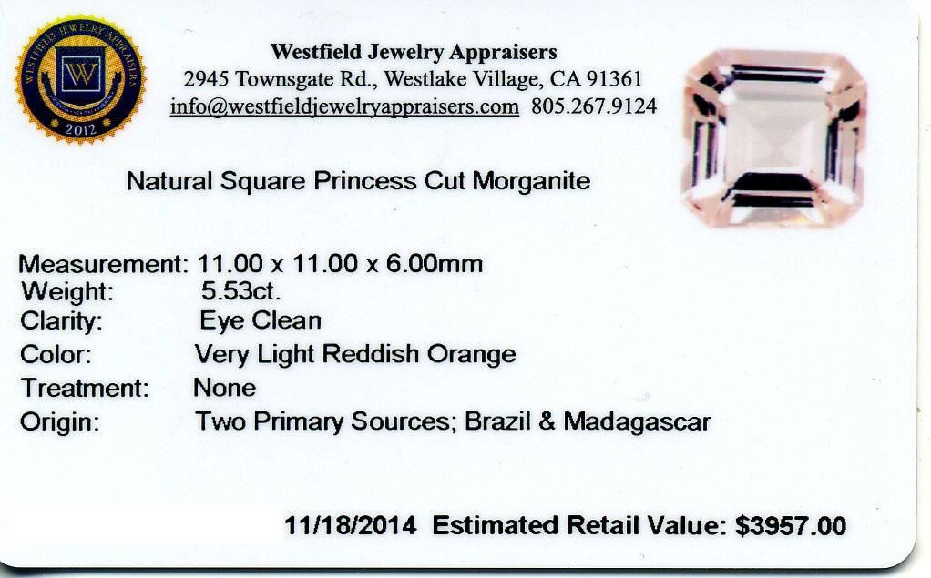 5.53ctw. Natural Square Princess Cut Morganite. Westfield Appraised at $3,957.00.