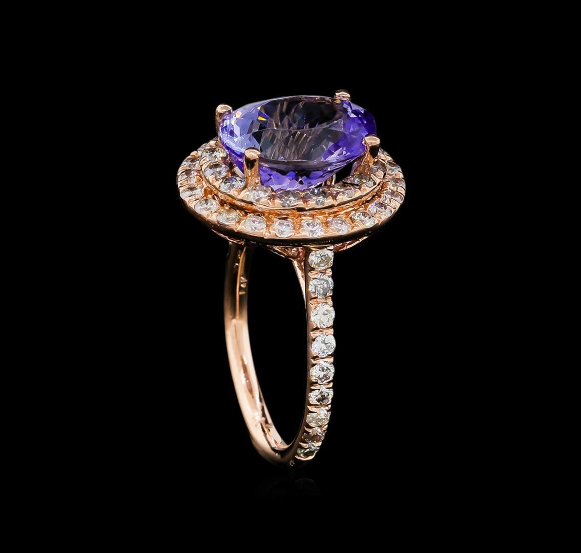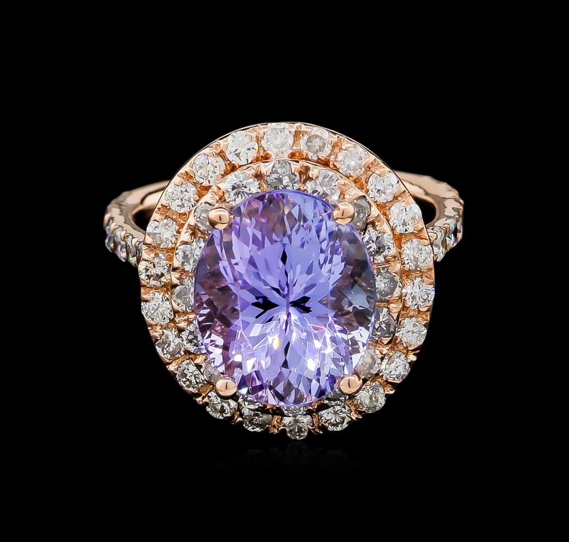 One electronically tested 14KT rose gold ladies cast tanzanite and diamond ring with a bright polish finish. The featured tanzanite is set within tiered diamond bezels supported by a tuliped under gallery and diamond ribbon shoulders, completed by a two millimeter wide band. Identified with markings of "14K". Condition is new, good workmanship. Containing: One prong set oval mixed cut natural tanzanite, measuring 11.50 x 9.30 x 7.00mm, 5%. bulge factor, approximate weight of 5.53ct., clarity is eye clean, type I, medium, very slightly grayish, violet color, (GIA V 5/3), cut is good. Transmitting light with no distortion, transparent. Colored Stone Grading Report attached. Graded in the setting. Tanzanite is a very rare gemstone that is only found in the country of Tanzania. Originally discovered in 1967. Tiffany & Company, named the stone Tanzanite. It is found in the Usumburu Mountains that border the Umba Valley of northern Tanzania. Tanzanite occurs in gray, brown, violet, blue, reddish-purple, & green. The gem is interesting because of its exceptional pleochroism. Rotated in different directions a tanzanite will exhibit multiple changes of color. Tanzanite has a low tolerance to ultrasonic cleaning, and should not be cleaned using this method. Fifty-Six prong set round brilliant cut diamonds, measuring 1.90 - 1.80 x 1.11mm (depth est.) approximate total weight of 56 Stones = 1.39ct. Graded in the setting. Clarity: SI-2 to I-2. Color: G - I. Total Weight of Colored Stones 5.53ct. Total Weight of Diamonds 1.39ct. Total Weight of Ring 5.78gm. AIG Appraised at $13,610.00.