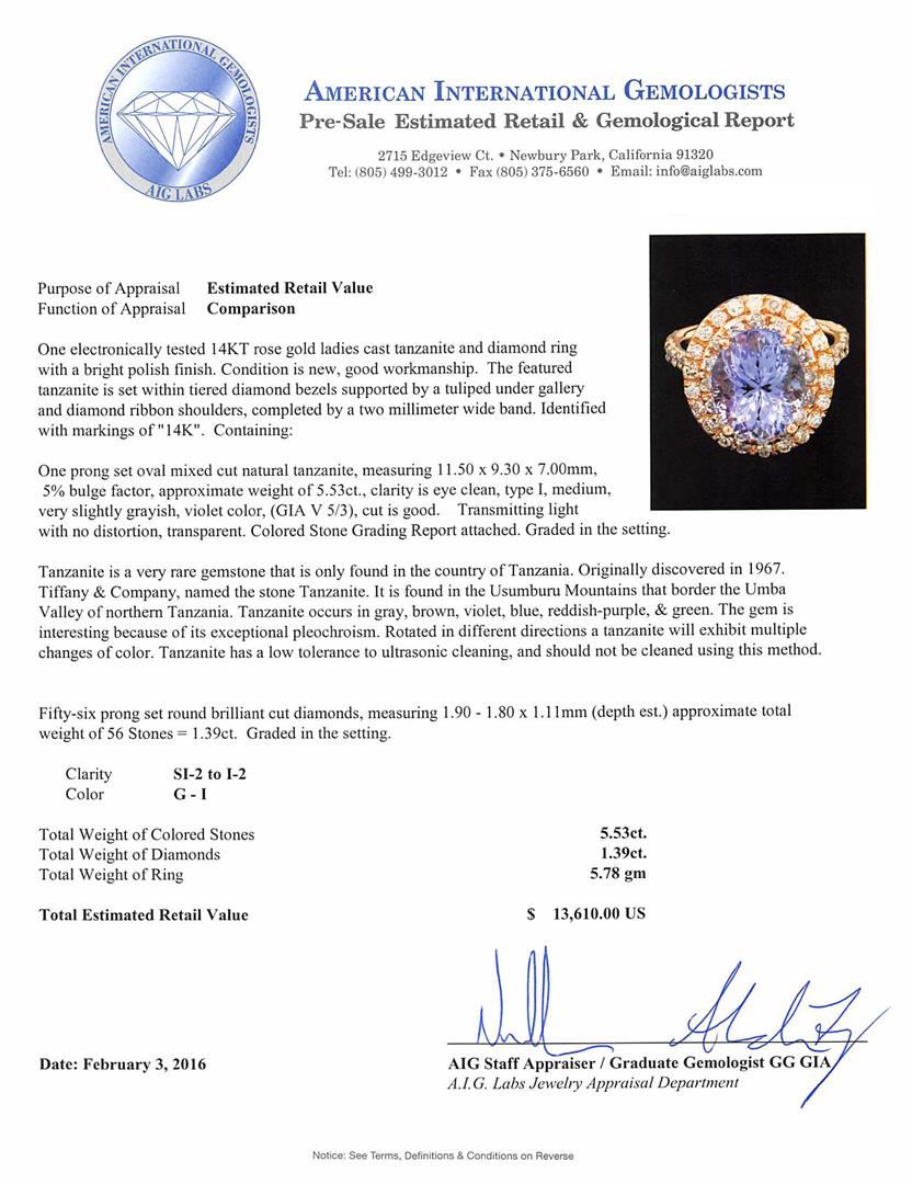 One electronically tested 14KT rose gold ladies cast tanzanite and diamond ring with a bright polish finish. The featured tanzanite is set within tiered diamond bezels supported by a tuliped under gallery and diamond ribbon shoulders, completed by a two millimeter wide band. Identified with markings of "14K". Condition is new, good workmanship. Containing: One prong set oval mixed cut natural tanzanite, measuring 11.50 x 9.30 x 7.00mm, 5%. bulge factor, approximate weight of 5.53ct., clarity is eye clean, type I, medium, very slightly grayish, violet color, (GIA V 5/3), cut is good. Transmitting light with no distortion, transparent. Colored Stone Grading Report attached. Graded in the setting. Tanzanite is a very rare gemstone that is only found in the country of Tanzania. Originally discovered in 1967. Tiffany & Company, named the stone Tanzanite. It is found in the Usumburu Mountains that border the Umba Valley of northern Tanzania. Tanzanite occurs in gray, brown, violet, blue, reddish-purple, & green. The gem is interesting because of its exceptional pleochroism. Rotated in different directions a tanzanite will exhibit multiple changes of color. Tanzanite has a low tolerance to ultrasonic cleaning, and should not be cleaned using this method. Fifty-Six prong set round brilliant cut diamonds, measuring 1.90 - 1.80 x 1.11mm (depth est.) approximate total weight of 56 Stones = 1.39ct. Graded in the setting. Clarity: SI-2 to I-2. Color: G - I. Total Weight of Colored Stones 5.53ct. Total Weight of Diamonds 1.39ct. Total Weight of Ring 5.78gm. AIG Appraised at $13,610.00.