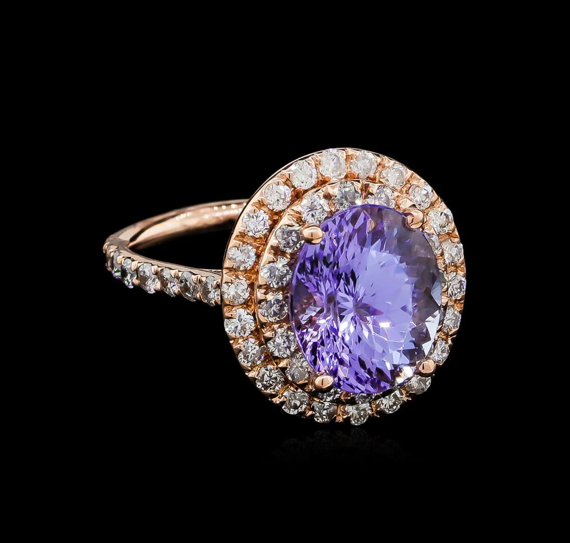 One electronically tested 14KT rose gold ladies cast tanzanite and diamond ring with a bright polish finish. The featured tanzanite is set within tiered diamond bezels supported by a tuliped under gallery and diamond ribbon shoulders, completed by a two millimeter wide band. Identified with markings of "14K". Condition is new, good workmanship. Containing: One prong set oval mixed cut natural tanzanite, measuring 11.50 x 9.30 x 7.00mm, 5%. bulge factor, approximate weight of 5.53ct., clarity is eye clean, type I, medium, very slightly grayish, violet color, (GIA V 5/3), cut is good. Transmitting light with no distortion, transparent. Colored Stone Grading Report attached. Graded in the setting. Tanzanite is a very rare gemstone that is only found in the country of Tanzania. Originally discovered in 1967. Tiffany & Company, named the stone Tanzanite. It is found in the Usumburu Mountains that border the Umba Valley of northern Tanzania. Tanzanite occurs in gray, brown, violet, blue, reddish-purple, & green. The gem is interesting because of its exceptional pleochroism. Rotated in different directions a tanzanite will exhibit multiple changes of color. Tanzanite has a low tolerance to ultrasonic cleaning, and should not be cleaned using this method. Fifty-Six prong set round brilliant cut diamonds, measuring 1.90 - 1.80 x 1.11mm (depth est.) approximate total weight of 56 Stones = 1.39ct. Graded in the setting. Clarity: SI-2 to I-2. Color: G - I. Total Weight of Colored Stones 5.53ct. Total Weight of Diamonds 1.39ct. Total Weight of Ring 5.78gm. AIG Appraised at $13,610.00.