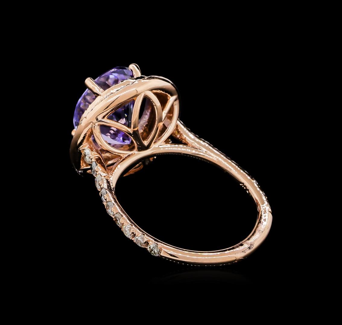One electronically tested 14KT rose gold ladies cast tanzanite and diamond ring with a bright polish finish. The featured tanzanite is set within tiered diamond bezels supported by a tuliped under gallery and diamond ribbon shoulders, completed by a two millimeter wide band. Identified with markings of "14K". Condition is new, good workmanship. Containing: One prong set oval mixed cut natural tanzanite, measuring 11.50 x 9.30 x 7.00mm, 5%. bulge factor, approximate weight of 5.53ct., clarity is eye clean, type I, medium, very slightly grayish, violet color, (GIA V 5/3), cut is good. Transmitting light with no distortion, transparent. Colored Stone Grading Report attached. Graded in the setting. Tanzanite is a very rare gemstone that is only found in the country of Tanzania. Originally discovered in 1967. Tiffany & Company, named the stone Tanzanite. It is found in the Usumburu Mountains that border the Umba Valley of northern Tanzania. Tanzanite occurs in gray, brown, violet, blue, reddish-purple, & green. The gem is interesting because of its exceptional pleochroism. Rotated in different directions a tanzanite will exhibit multiple changes of color. Tanzanite has a low tolerance to ultrasonic cleaning, and should not be cleaned using this method. Fifty-Six prong set round brilliant cut diamonds, measuring 1.90 - 1.80 x 1.11mm (depth est.) approximate total weight of 56 Stones = 1.39ct. Graded in the setting. Clarity: SI-2 to I-2. Color: G - I. Total Weight of Colored Stones 5.53ct. Total Weight of Diamonds 1.39ct. Total Weight of Ring 5.78gm. AIG Appraised at $13,610.00.