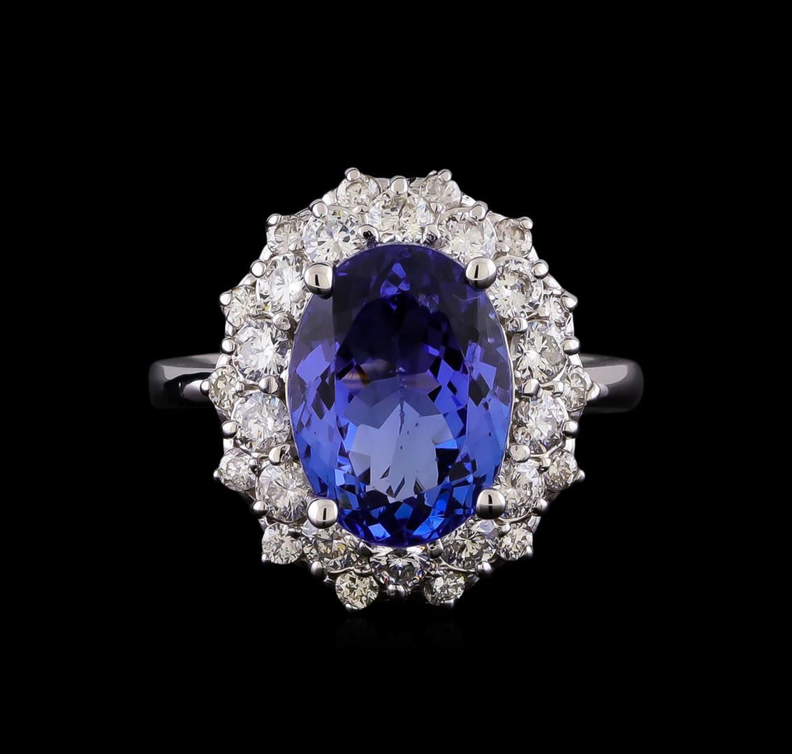 One electronically tested 14KT white gold lady's cast fashion ring with a double basket halo with a bright polish finish. The featured lady's has a shank measuring 2.58 millimeters in width. Identified with markings of "K14". Condition is new, good workmanship. Containing: One prong set oval modified brilliant cut natural tanzanite, measuring 12.62 x 9.19 x 6.20mm, (depth est.) approximate weight of 5.53ct., clarity is eye clean, medium, moderately strong, bluish violet color, (GIA bV 5/4), cut is very good. Transmitting light with no distortion, transparent. Colored gemstones are presumed to have been subjected to commonly used enhancement processes. Graded in the setting. Fourteen prong set round brilliant cut diamonds, measuring 2.55 - 2.50 x 1.56mm (depth est.) approximate total weight of 14 Stones = 0.86ct. Graded in the setting. Clarity: SI-1 to SI-2. Color: H - I. Cut Good Fourteen prong set round brilliant cut diamonds, measuring 1.85 - 1.80 x 1.12mm (depth est.) approximate total weight of 14 Stones = 0.32ct. Graded in the setting. Clarity: SI-1 to SI-2. Color: H - I. Cut Good. Total Weight of Colored Stones 5.53ct. Total Weight of Diamonds 1.18ct. Total Weight of Ring 6.80gm. GAS Appraised.