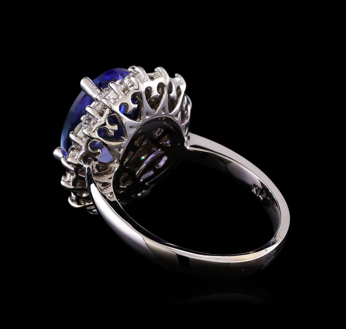 One electronically tested 14KT white gold lady's cast fashion ring with a double basket halo with a bright polish finish. The featured lady's has a shank measuring 2.58 millimeters in width. Identified with markings of "K14". Condition is new, good workmanship. Containing: One prong set oval modified brilliant cut natural tanzanite, measuring 12.62 x 9.19 x 6.20mm, (depth est.) approximate weight of 5.53ct., clarity is eye clean, medium, moderately strong, bluish violet color, (GIA bV 5/4), cut is very good. Transmitting light with no distortion, transparent. Colored gemstones are presumed to have been subjected to commonly used enhancement processes. Graded in the setting. Fourteen prong set round brilliant cut diamonds, measuring 2.55 - 2.50 x 1.56mm (depth est.) approximate total weight of 14 Stones = 0.86ct. Graded in the setting. Clarity: SI-1 to SI-2. Color: H - I. Cut Good Fourteen prong set round brilliant cut diamonds, measuring 1.85 - 1.80 x 1.12mm (depth est.) approximate total weight of 14 Stones = 0.32ct. Graded in the setting. Clarity: SI-1 to SI-2. Color: H - I. Cut Good. Total Weight of Colored Stones 5.53ct. Total Weight of Diamonds 1.18ct. Total Weight of Ring 6.80gm. GAS Appraised.
