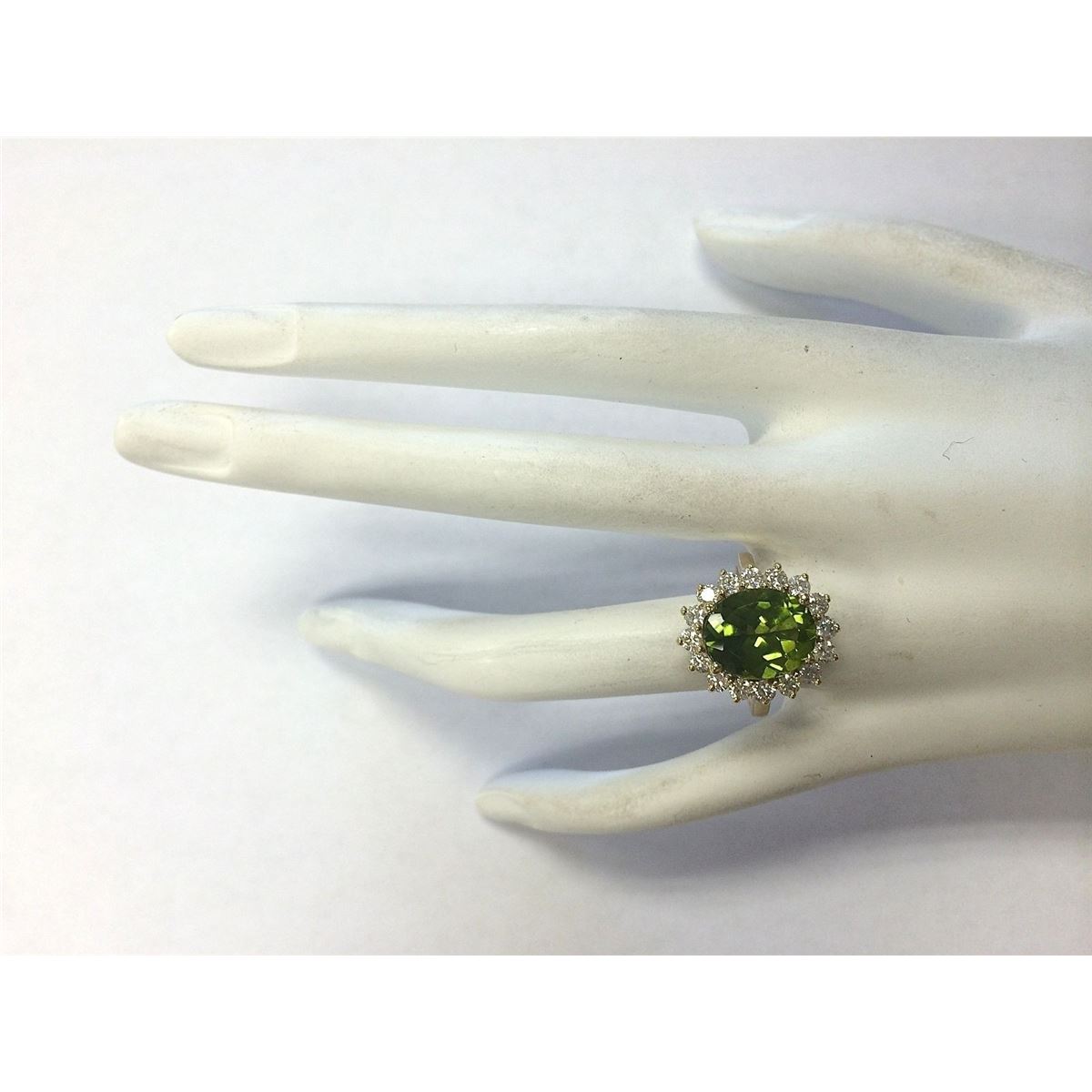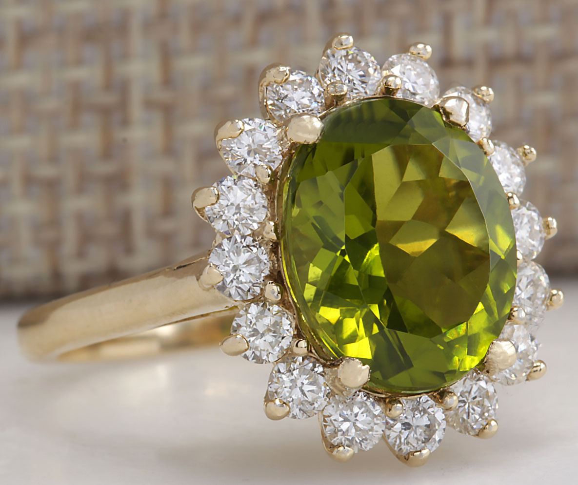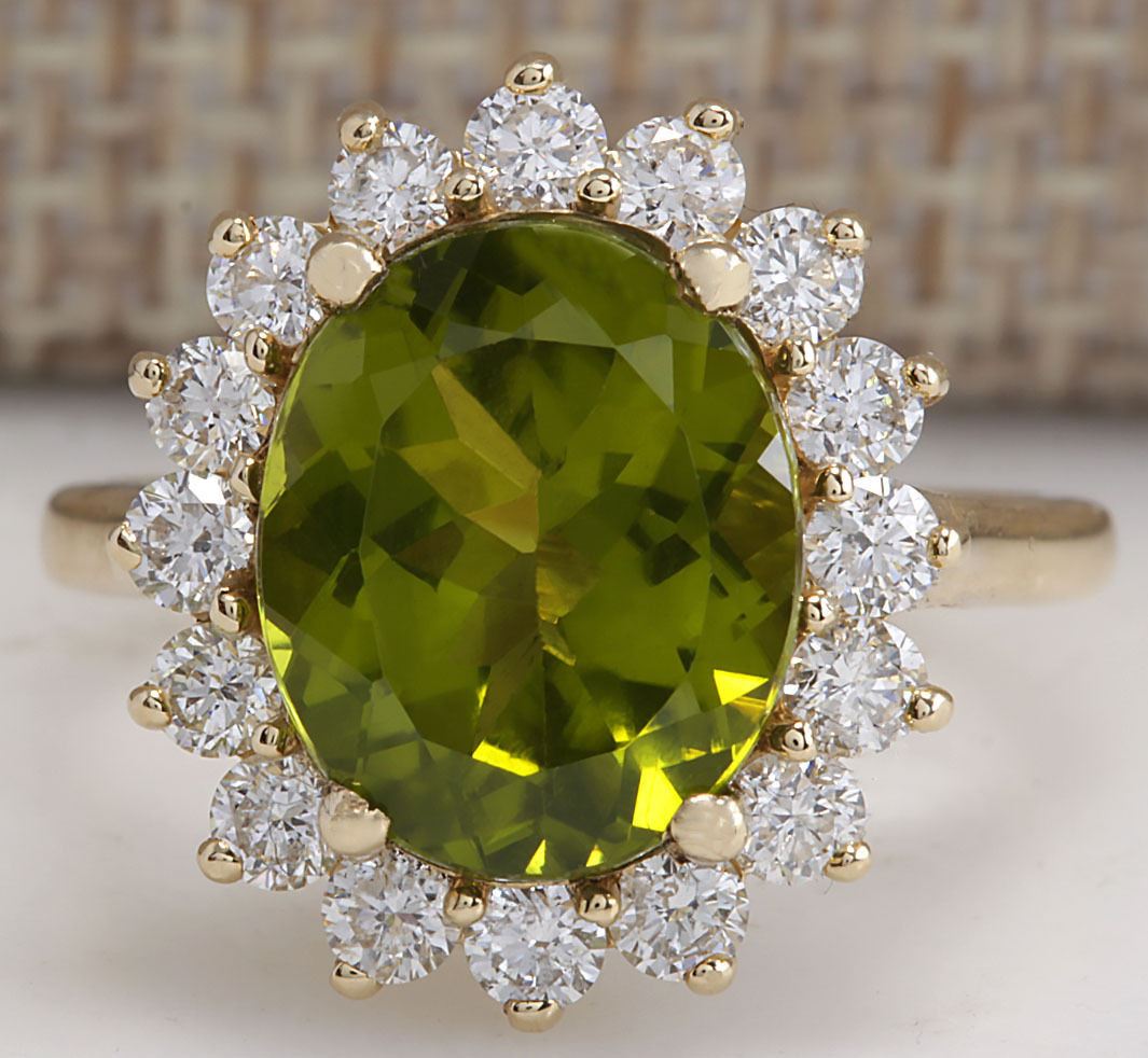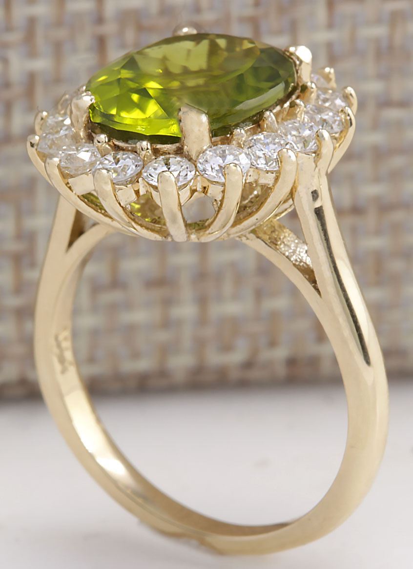 Stamped: 14K Ring Size: 6.25 Total Ring Weight: 5 Grams Diamond Weight: Total natural diamond weight is 1.06carat. SI1-SI2 clarity / G-H color Gemstone Weight: Total Natural Peridot Weight is 4.47ctw (Measures: 11.90x9.91mm) Face Measures: 17.76x15.64mm Main stone color: Green [SKU:702638]
