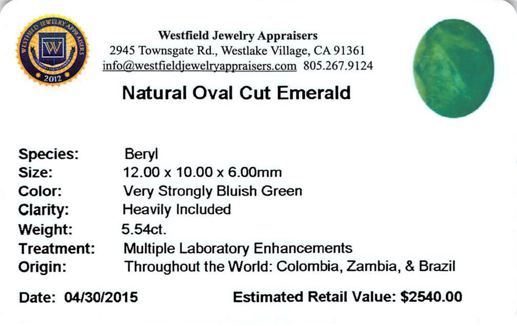 One oval mixed cut natural emerald exact weight 5.54ct., clarity is heavily included, type III, medium dark, very slightly grayish, very strongly bluish green color, (GIA vstbG 6/3), cut is good. Westfield Appraised at $2,540.00.