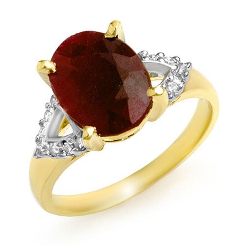 REF-40N2Y -12981 ---- 5.55 CTW Ruby & Diamond Ring 10K Yellow Gold ---- Luxury Designer Brand Ring Appraised at $2,650 Certificate Number US12981 10k Yellow gold, Ring Size is 6.5, Ring measuring approx. 7/16" x 5/8 , weighing in total approx. 4 grams. Made in the USA and is stamped 10k, Main stone 5.35 carat total weight containing 1 pieces of Mid-Opaque-Deep Red color with AAA quality Oval shape cut Ruby , Stone #2 0.2 carat total weight containing 14 pieces of H-I color with VS/SI quality Round shape cut Diamond
