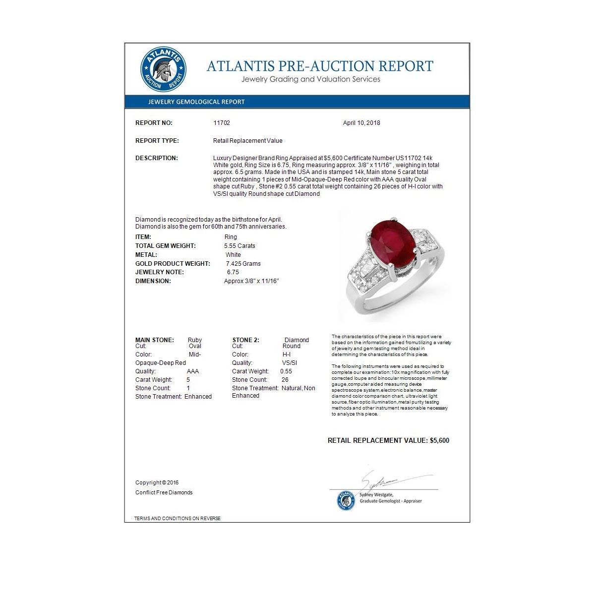 REF-78N2Y -11702 ---- 5.55 CTW Ruby & Diamond Ring 14K White Gold ---- Luxury Designer Brand Ring Appraised at $5,600 Certificate Number US11702 14k White gold, Ring Size is 6.75, Ring measuring approx. 3/8" x 11/16" , weighing in total approx. 6.5 grams. Made in the USA and is stamped 14k, Main stone 5 carat total weight containing 1 pieces of Mid-Opaque-Deep Red color with AAA quality Oval shape cut Ruby , Stone #2 0.55 carat total weight containing 26 pieces of H-I color with VS/SI quality Round shape cut Diamond