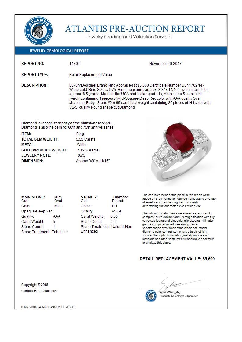 11702 - REF-78Y2X ---- 5.55 CTW Ruby & Diamond Ring 14K White Gold ---- Luxury Designer Brand Ring Appraised at $5,600 Certificate Number US11702 14k White gold, Ring Size is 6.75, Ring measuring approx. 3/8" x 11/16" , weighing in total approx. 6.5 grams. Made in the USA and is stamped 14k, Main stone 5 carat total weight containing 1 pieces of Mid-Opaque-Deep Red color with AAA quality Oval shape cut Ruby , Stone #2 0.55 carat total weight containing 26 pieces of H-I color with VS/SI quality Round shape cut Diamond