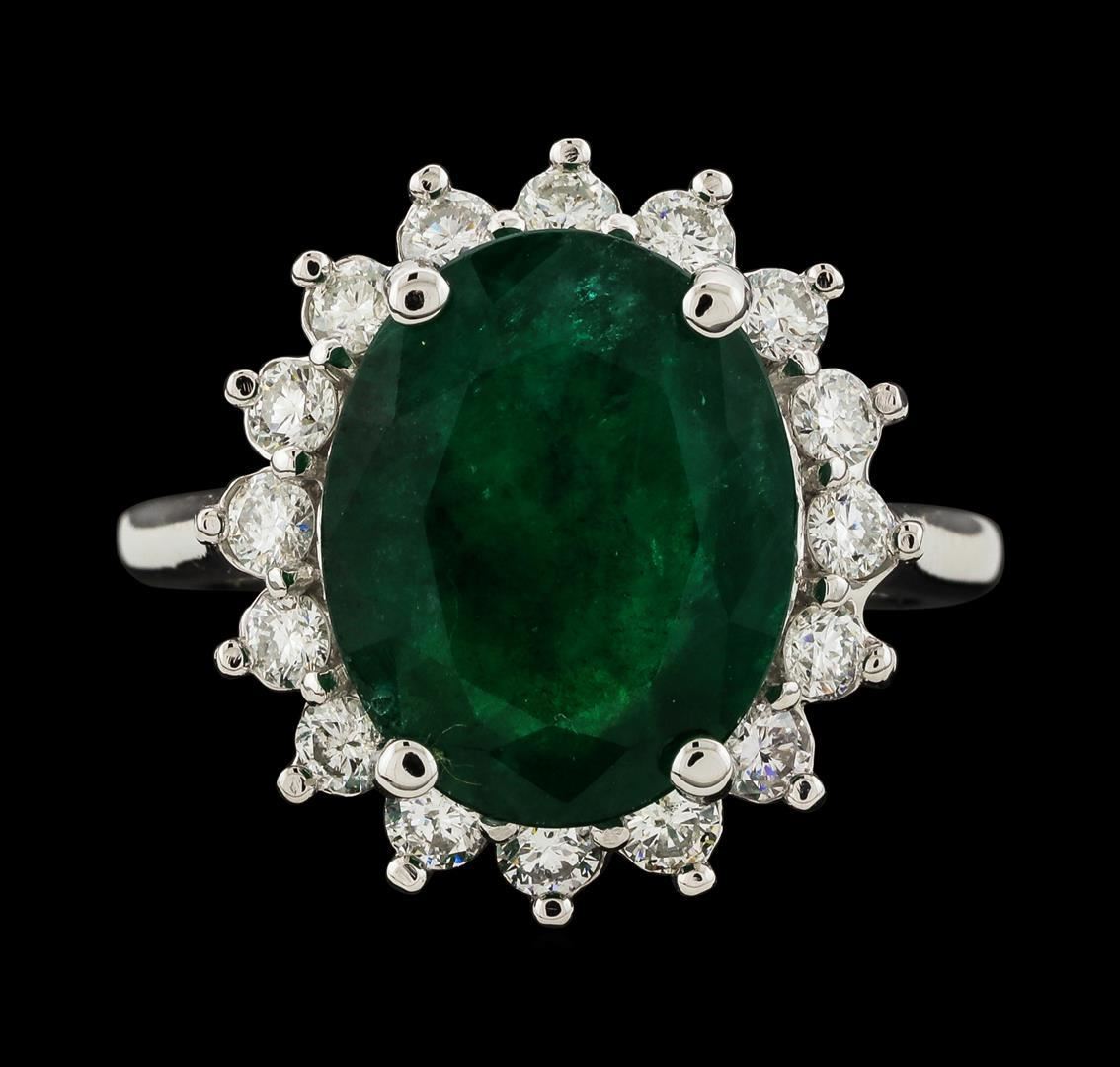 One electronically tested 14KT white gold lady's cast fashion ring with a basket halo with a bright polish finish. The featured lady's ring has a shank measuring 2.04 millimeters wide. Identified with markings of '14K'. Condition is new, good workmanship. Containing: One prong set oval modified mixed cut natural emerald, measuring 13.72 x 10.90 x 5.55mm, (depth est.) 15%. bulge factor, approximate weight of 5.55ct., clarity is heavily included, medium dark, moderately strong, green color, (GIA G 6/4), cut is good. Transmitting light somewhat diffusely, semi-transparent to translucent. Naturally occurring internal & external characteristics are present. Indications of oil residue. Colored gemstones are presumed to have been subjected to commonly used enhancement processes. Graded in the setting. Sixteen prong set round brilliant cut diamonds, measuring 2.40 - 2.30 x 1.46mm (depth est.) approximate total weight of 16 Stones = 0.80ct. Graded in the setting. Clarity SI-1 to SI-2. Color: G - H Cut Good. Total Weight of Colored Stones 5.55ct.. Total Weight of Diamonds 0.80ct.. Total Weight of Ring 6.50gm GAS Appraised.
