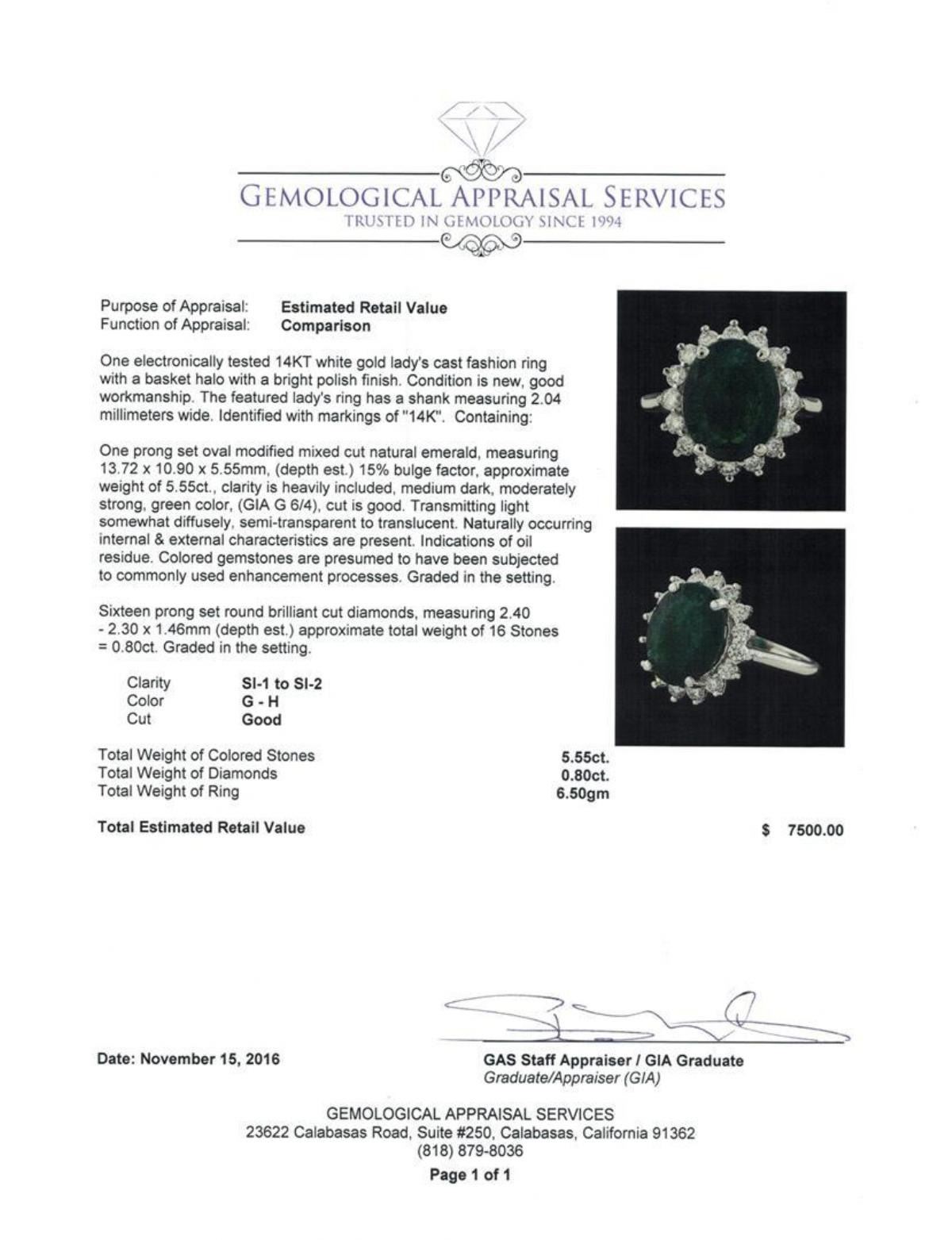 One electronically tested 14KT white gold lady's cast fashion ring with a basket halo with a bright polish finish. The featured lady's ring has a shank measuring 2.04 millimeters wide. Identified with markings of '14K'. Condition is new, good workmanship. Containing: One prong set oval modified mixed cut natural emerald, measuring 13.72 x 10.90 x 5.55mm, (depth est.) 15%. bulge factor, approximate weight of 5.55ct., clarity is heavily included, medium dark, moderately strong, green color, (GIA G 6/4), cut is good. Transmitting light somewhat diffusely, semi-transparent to translucent. Naturally occurring internal & external characteristics are present. Indications of oil residue. Colored gemstones are presumed to have been subjected to commonly used enhancement processes. Graded in the setting. Sixteen prong set round brilliant cut diamonds, measuring 2.40 - 2.30 x 1.46mm (depth est.) approximate total weight of 16 Stones = 0.80ct. Graded in the setting. Clarity SI-1 to SI-2. Color: G - H Cut Good. Total Weight of Colored Stones 5.55ct.. Total Weight of Diamonds 0.80ct.. Total Weight of Ring 6.50gm GAS Appraised.
