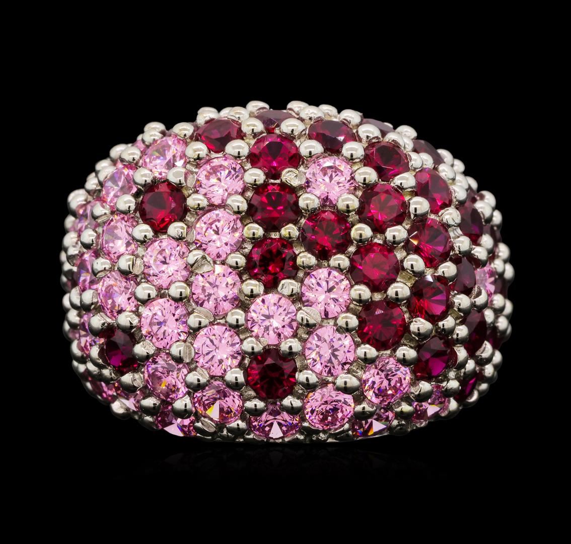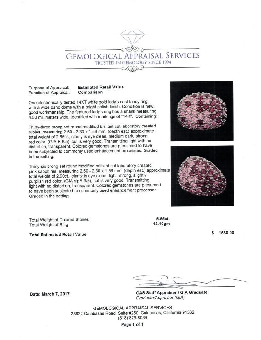 One electronically tested 14KT white gold lady's cast fancy ring with a wide band dome with a bright polish finish. The featured lady's ring has a shank measuring 4.50 millimeters wide. Identified with markings of '14K'. Condition is new, good workmanship GAS Appraised at $1,530.00.