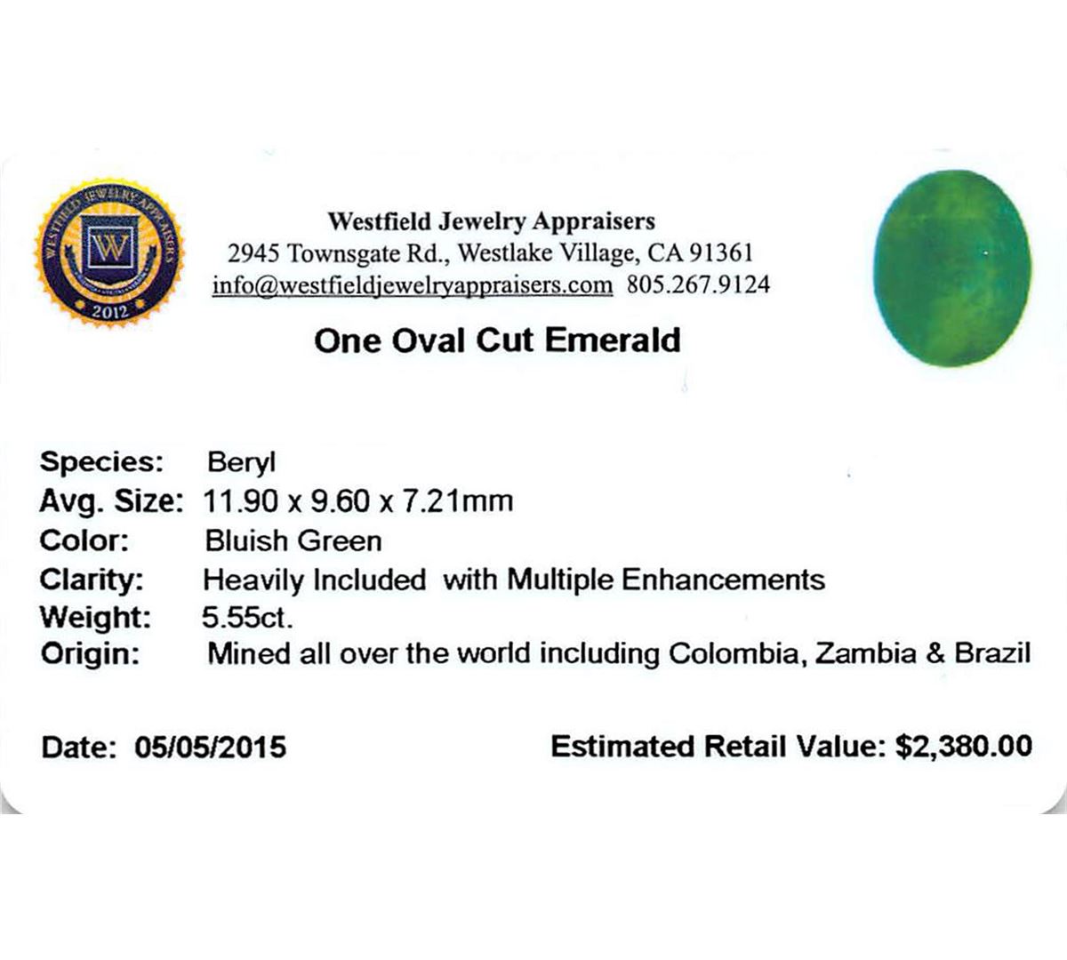 One oval mixed cut emerald, measuring 11.90 x 9.60 x 7.21mm, approximate weight of 5.55ct., clarity is heavily included, type III, dark, very slightly grayish, bluish green color, (GIA bG 7/3), cut is good. Indications of multiple laboratory enhancements, including high temperature heat treatment. Westfield Appraised at $2,380.00.