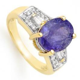 Diamond: 8 RD & BGT cut @ 0.55 ctw Clarity: SI-I Color: H-K Gemstone: Natural Tanzanite Gemstone color: PurpleGemstone quality: Good-to-Very Good Gemstone Cut & Weight: 1 Oval cut @ 5.0 ctw Metal Purity & Color : 10K Gold-Yellow Gold weight: 5.40 grams Ring size (US): 6.75Dimension: Approx. 3/8" x 11/16"