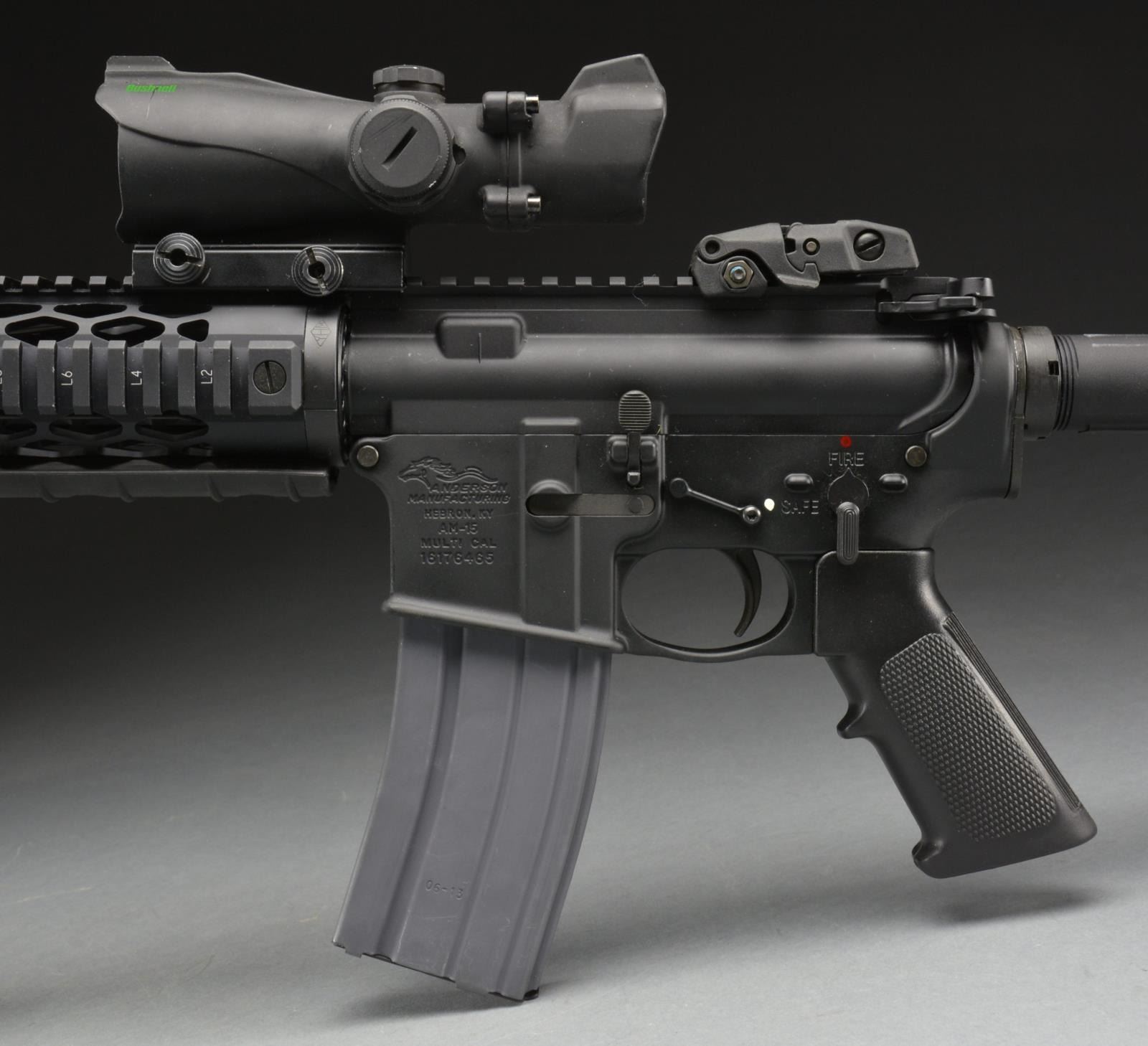 MANUFACTURING. Cal. 5.56 MM. S# 16176465. Bbl. 16”. Heavily accessorized custom assembled black rifle. Heavy bbl. w/ threaded muzzle terminated w/ A2 flash hider. Free floating 12” YHM quad rail for 18” of regulated mounting space at 12:00. Bottom rail plays host to CAA FVG & Harris style tubular UTG telescoping bipod. YHM folding front sight mounted on integral gas block/bayonet lug that appears to be duplicative since this system utilizes a midlength DGI gas system located under handguard. 6.5” Flashlight mounted at 9:00. Mounted mid length of rail is a Bushnell type red/green electronic sight. Black Magpul MBUS sight mounted at rear of rail. Flat top upper receiver w/ brass deflector & rnd. forward assist. Anderson lower w/ enlarged trigger guard utilizes extended magazine release, anti-walk pins & ambidextrous safety/ selector. Red & white dot mark Safe/Fire positions on both sides of receiver. 6 Position collapsible shoulder stock w/ slip on US Ordnance marked recoil pad. Black nylon sling attached at shoulder stock & QD socket mounted at 12:00 on YHM rail. MAGS: 1 aluminum 30 rd. CONDITION: several aspects of outward appearance indicate extremely low use. Bushnell sight appears to function in both red & green, though crosshair seems a bit blurry. Flashlight appears to work correctly. Shiny bore w/ decent rifling & fire control mechanism appears to function correctly when cycled by hand. (21-1485/JZ). MODERN. $600-900.