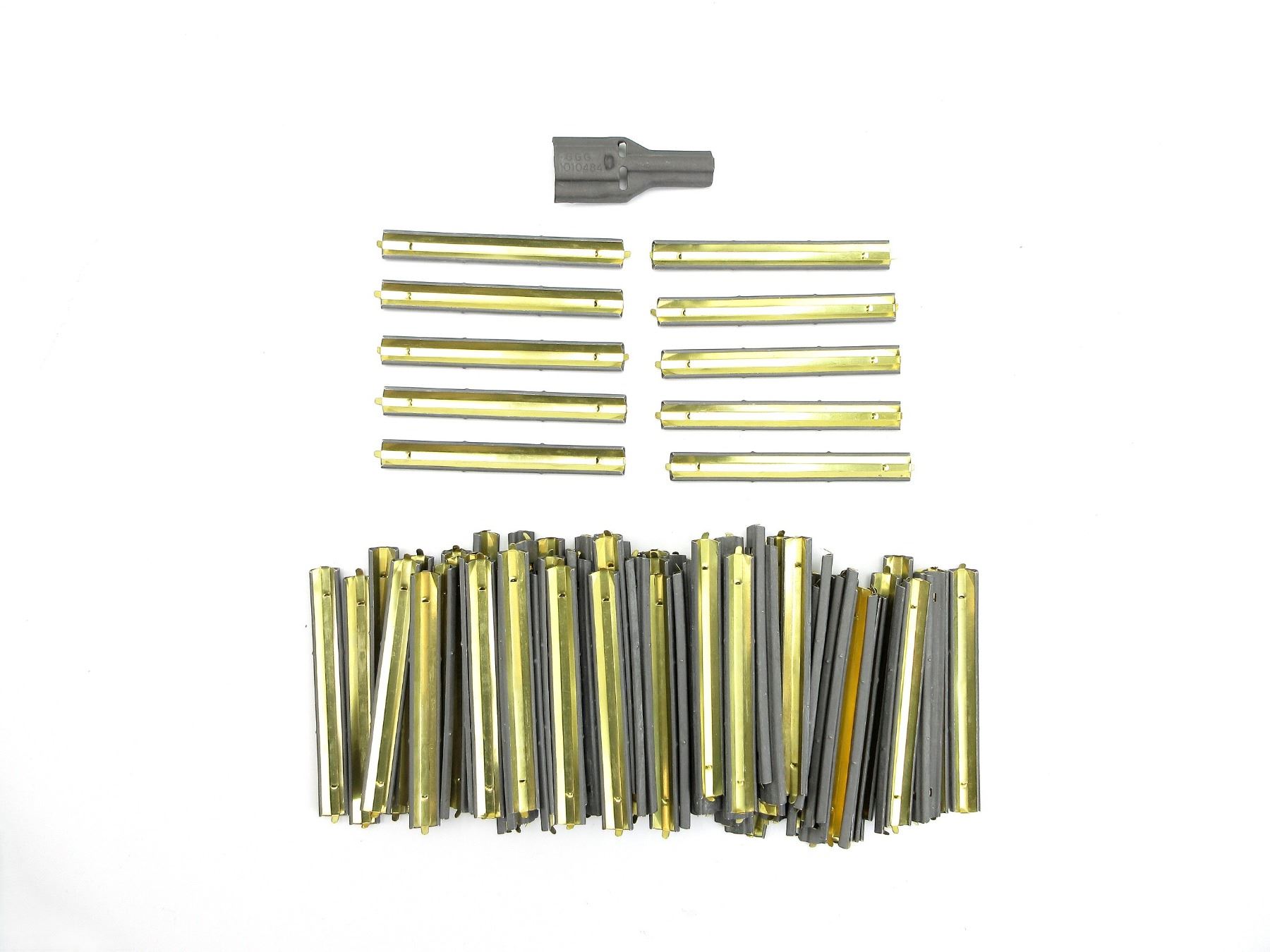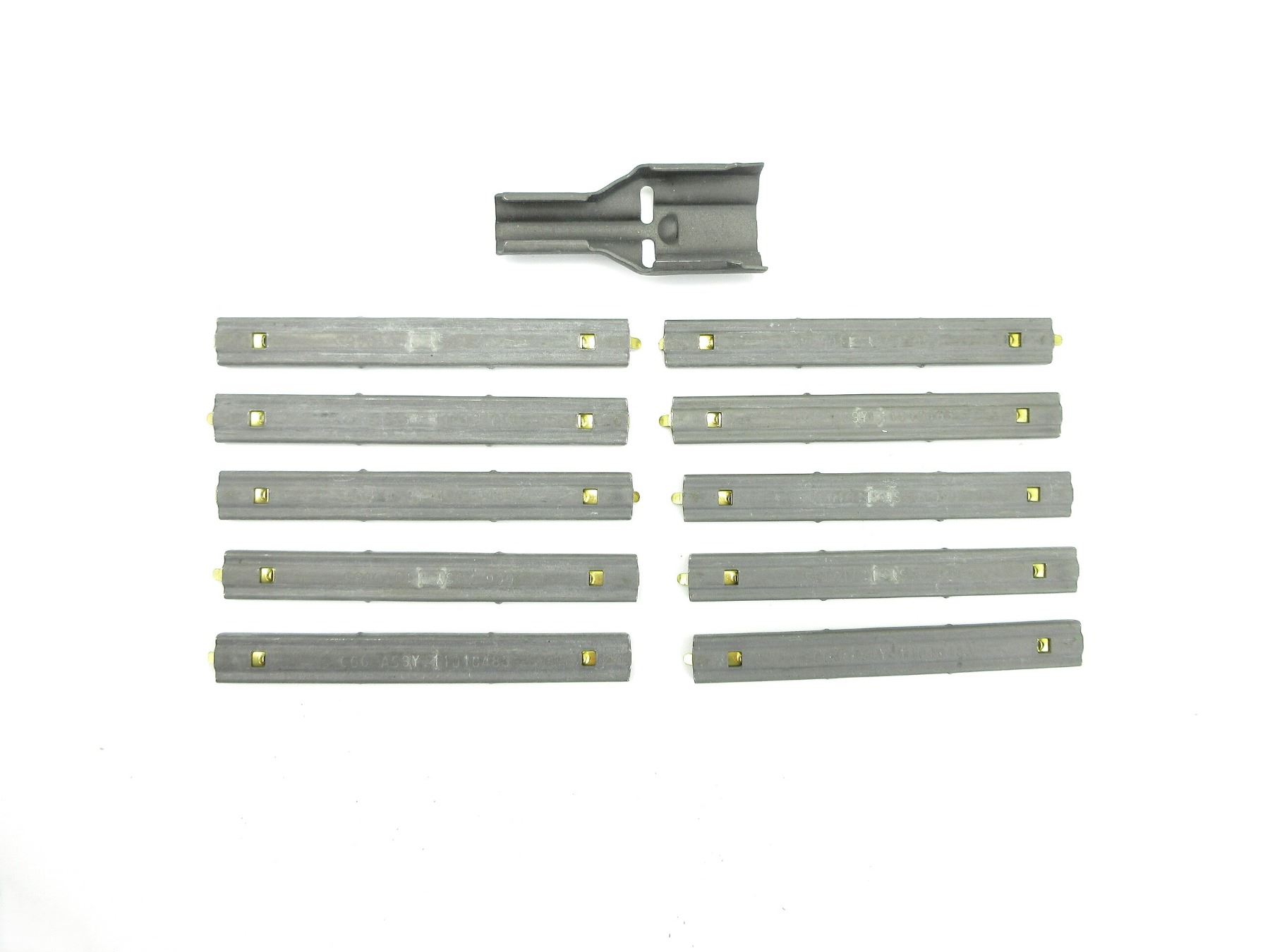 LOT INCLUDES; APPROX. (100) 5.56 NATO STRIPPER CLIPS, FITS M-16 / AR-15 / ETC., METAL, 10 RNDS, MOST MARKED: "GGG ASSY 11010483" & (1) STEEL 5.56MM STRIPPER CLIP GUIDE, MARKED: "G.G.G., 11010484". SEE PHOTOS.