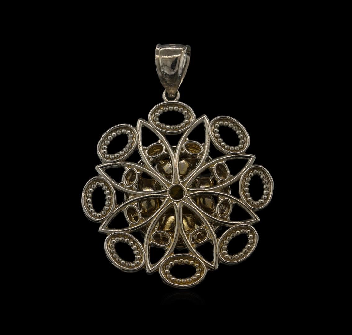 One electronically tested 14KT white gold lady's cast fashion pendant with a bright polish finish. Identified with markings of "14K". Condition is new, good workmanship. Containing: One prong set round mixed cut natural citrine quartz, measuring 11.97 - 11.90 x 7.30 mm, approximate weight of 5.56ct., clarity is eye clean, type I, medium dark, moderately strong, orangy yellow color, (GIA oY 6/4), cut is very good. Colored gemstones are presumed to have been subjected to commonly used enhancement processes. Graded in the setting. Thirty-Four prong set round brilliant cut diamonds, measuring 1.50 - 1.40 x 0.87mm (depth est.) approximate total weight of 34 Stones = 0.40ct. Graded in the setting. Clarity: I-1 to I-2. Color: I - Fair. Total Weight of Colored Stones 5.56ct. Total Weight of Diamonds 0.40ct. Total Weight of Pendant 10.00gm. GAS Appraised at $2,825.00.