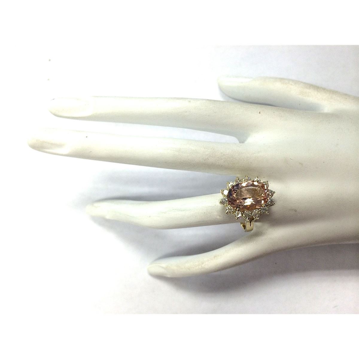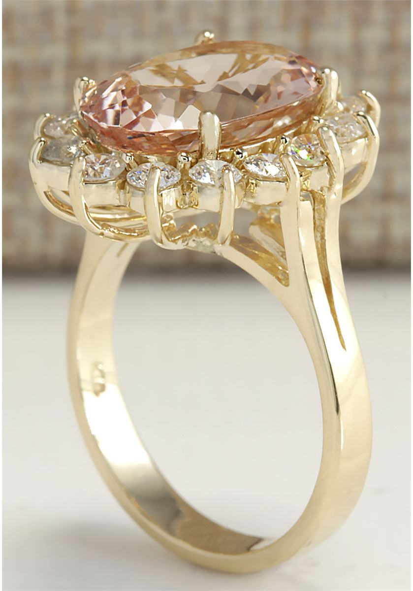 Stamped: 14K Ring Size: 6.25 Total Ring Weight: 5.5 Grams Diamond Weight: Total natural diamond weight is 1.04carat. SI1-SI2 clarity / G-H color Natural Morganite Weight is 4.62ctw (Measures: 13.93x10.02mm) Face Measures: 19.23x15.65mm Main stone color: Peach [SKU:702635]