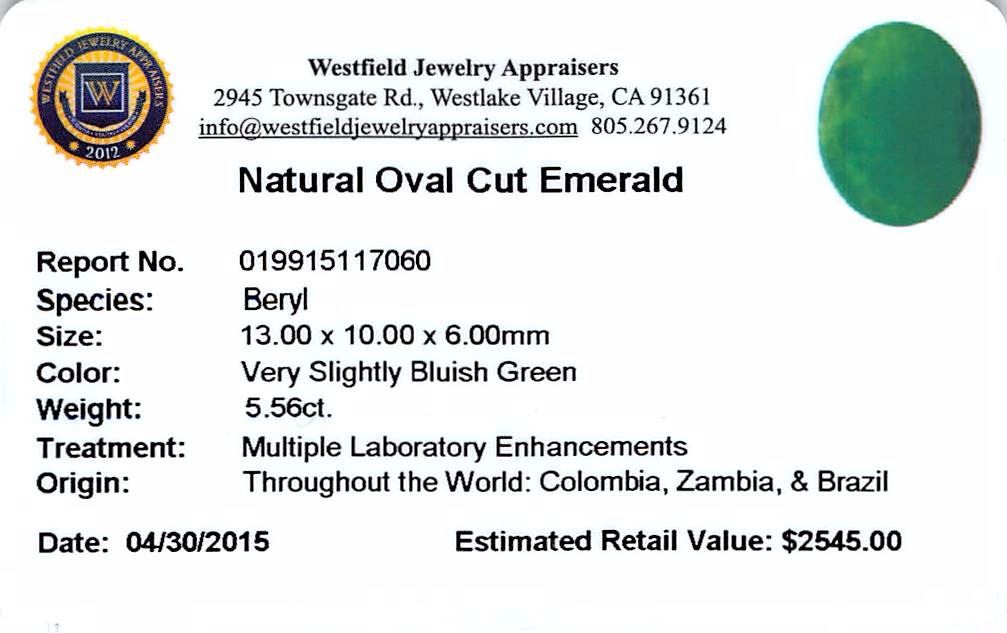 One oval mixed cut natural emerald exact weight 5.56ct., clarity is heavily included, type III, medium dark, very slightly grayish, very slightly bluish green color, (GIA vslbG 6/3), cut is good. Westfield Appraised at $2,545.00.