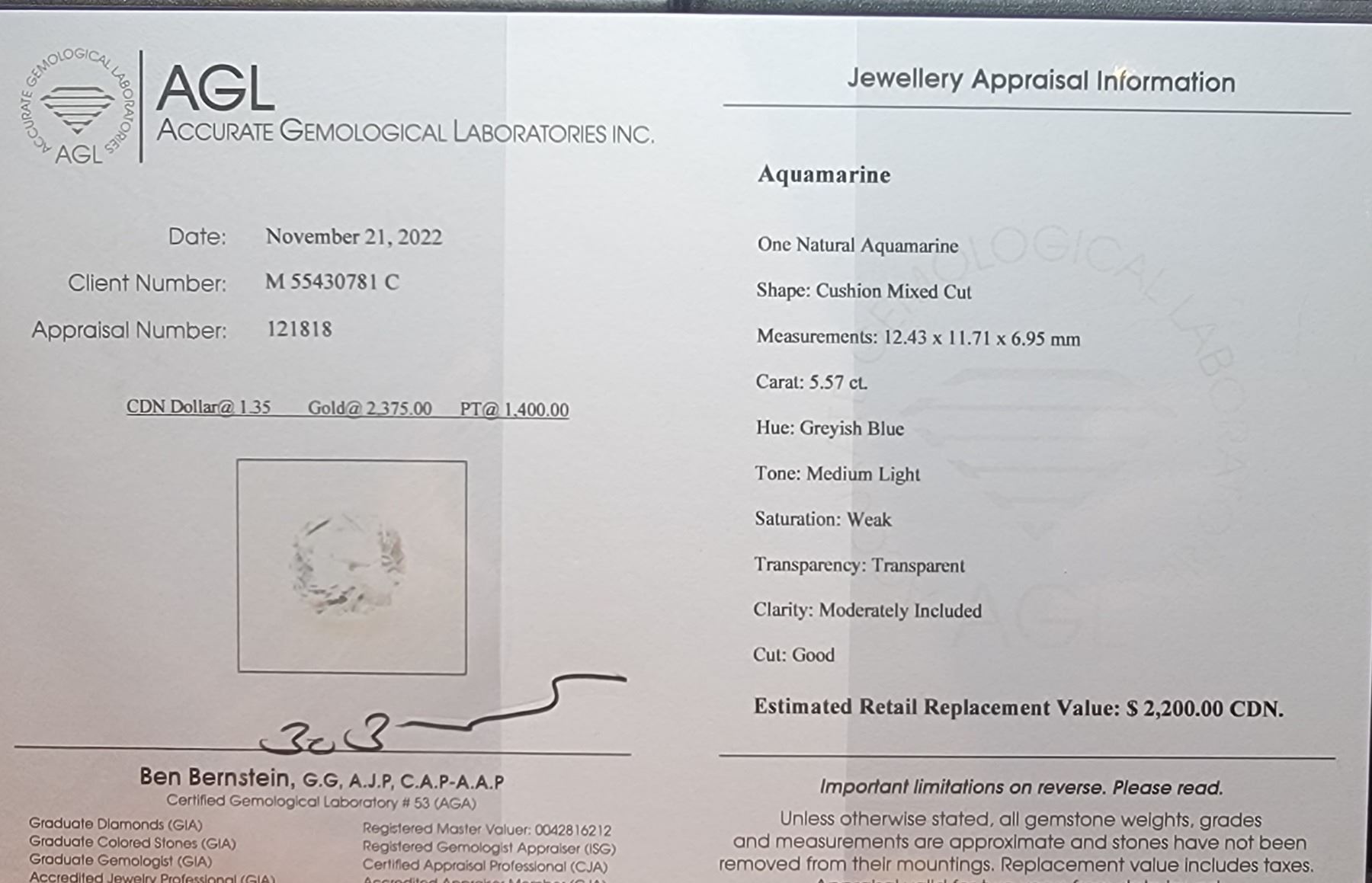 $2200 APPRAISAL, CUSHION CUT - INCLUDES APPRAISAL CERTIFICATE **ALL ITEMS MUST BE REMOVED BY 5PM SATURDAY, MAY 13TH 2023. ALL REMAINING ITEMS WILL BE SUBJECT TO A $6.00 PER DAY STORAGE CHARGE. ANY ITEMS REMAINING AFTER MONDAY, MAY 29TH, 2023 WILL BE CONSIDERED FORFEITED. NO REFUNDS WILL BE ISSUED FOR FORFEITED ITEMS. TO SCHEDULE A PICK UP APPOINTMENT CLICK HERE