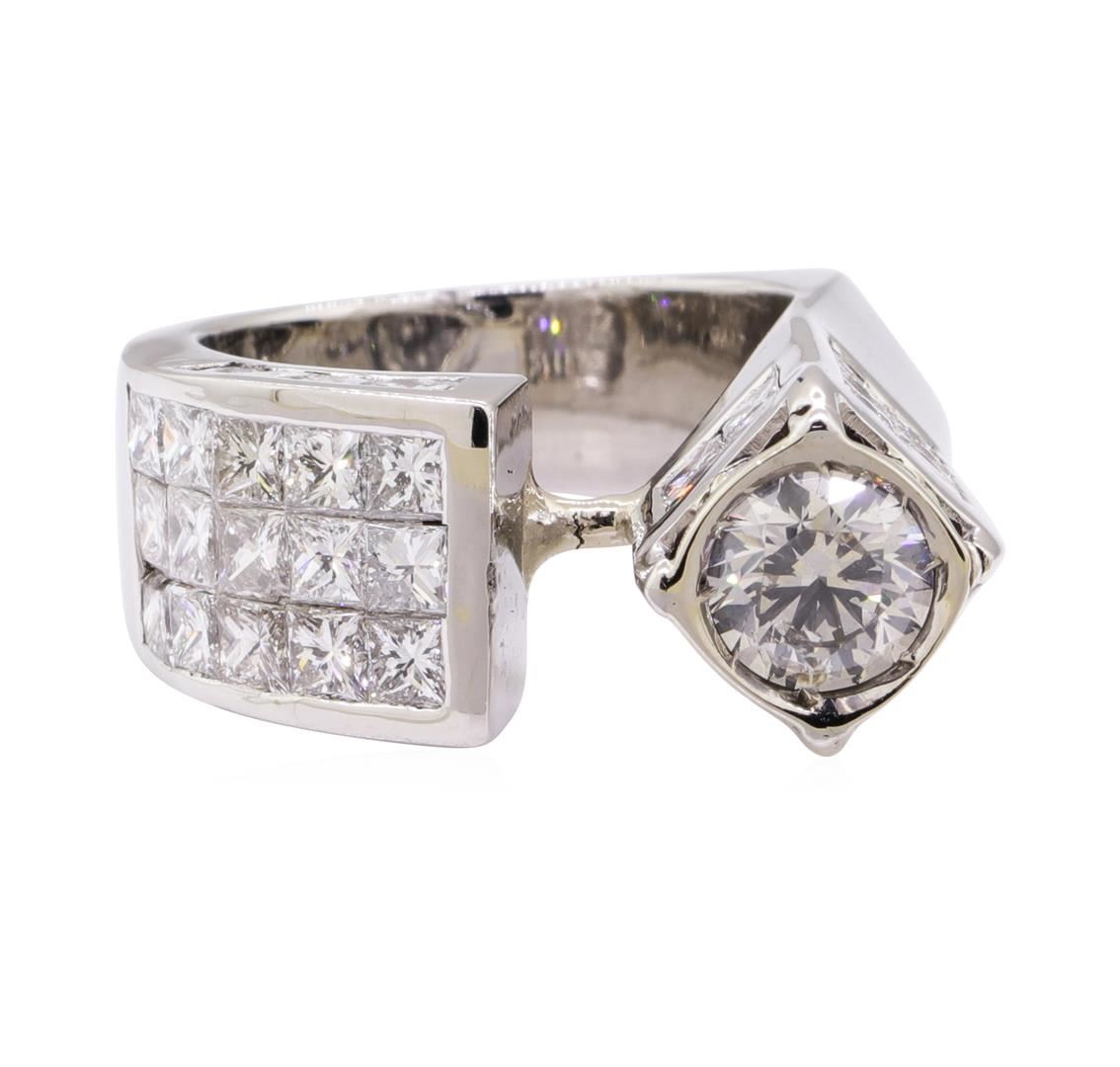 One electronically tested platinum lady's cast fashion ring with a European shank with a bright polish finish. The featured lady's ring has a shank measuring 8.00 millimeters wide. Identified with markings of '900'. Condition is like new, good workmanship. Containing: One bezel set round brilliant cut diamond, measuring 7.20 - 7.10 x 4.40mm (depth est.) approximate weight of 1.37ct. Graded in the setting. Color J Clarity SI-3 Cut Very Good Thirty-Nine invisible set princess cut diamonds, measuring 2.80 x 2.40 x 1.80mm (depth est.) approximate total weight of 39 Stones = 3.90ct. Graded in the setting. Color H - I Clarity VS-1 to VS-2 Cut Very Good Eight channel set princess cut diamonds, measuring 2.50 x 2.00 x 1.50mm (depth est.) approximate total weight of 8 Stones = 0.50ct. Graded in the setting. Color H - I Clarity VS-1 to VS-2 Cut Very Good. Total Weight of Diamonds 5.77ct.. Total Weight of Ring 29.20gm GAS Appraised at $20375.00. GAS Appraised at $20,375.00.