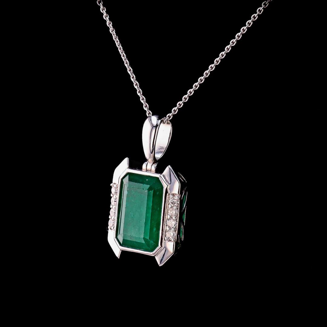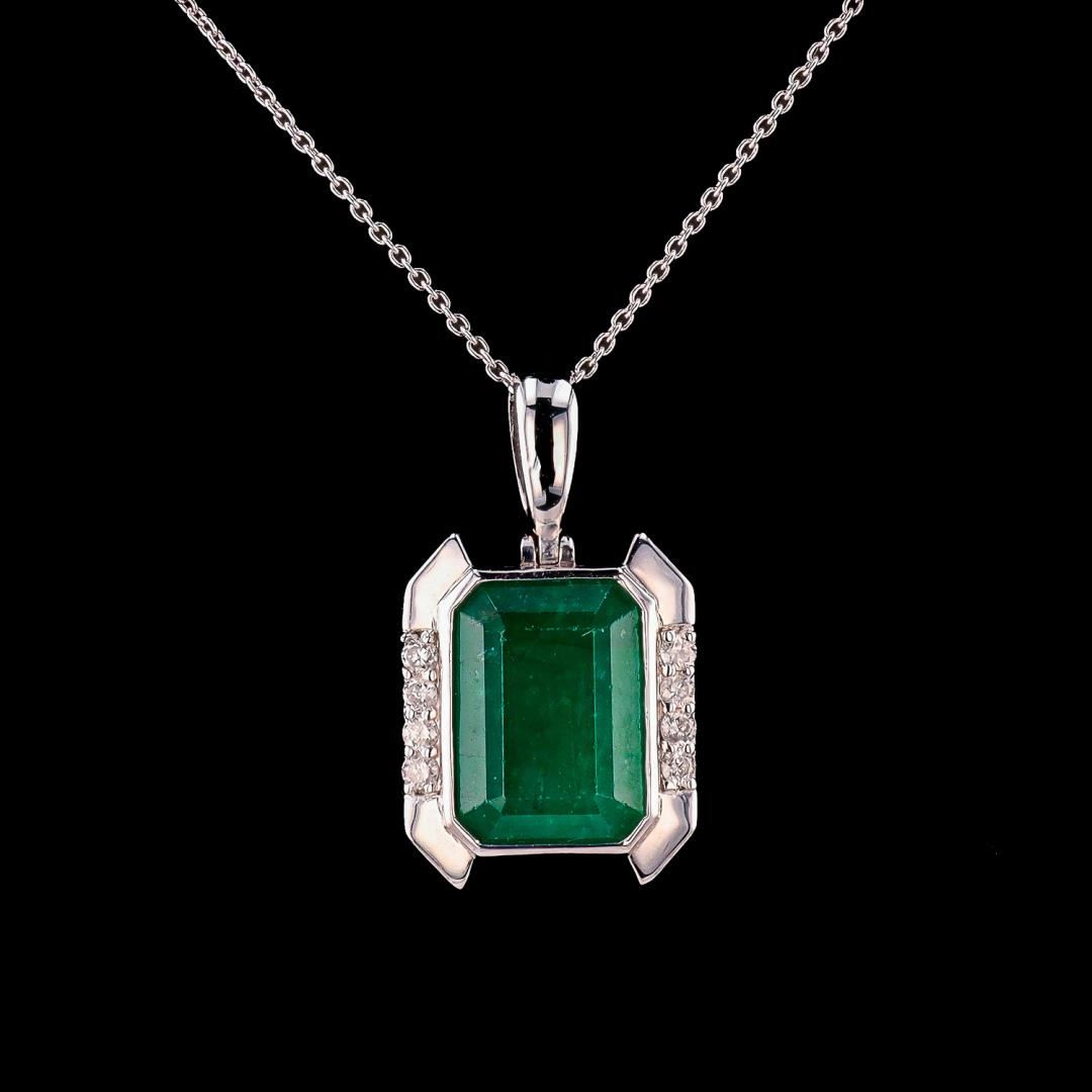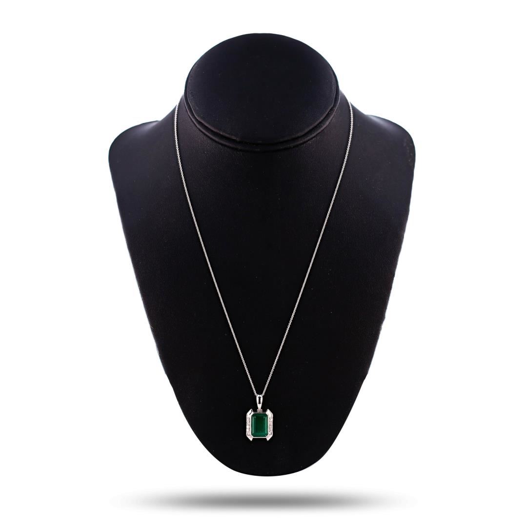 One polished, stamped, and tested platinum pendant marked Oscar Friedman. The pendant is mounted with: 1 genuine emerald center stone weighing approximately 5.57 carat, and 8 genuine round diamonds weighing approximately 0.16 carats. The pendant hangs from a platinum link chain measuring 18 inches in length. This item weighs 7.2 grams, condition is new, excellent workmanship. #MAIN GEMSTONE# Species: Natural Beryl Variety: Emerald Shape: Octagonal Cutting Style: Step Cut Measurements: 11.8 x 8.7 x 6.1mm Weight: 5.57 carat Color: Green Cut Grade: Very Good Refractive Index: 1.564 - 1.595 DR Birefringence: 0.005 to 0.009 Hardness: 7.5 - 8 #ADJACENT GEMSTONES ON PENDANT# Identity: Natural Diamond Shape: Round Cutting Style: Brilliant Cut Quantity: 8 Diamonds Measurements: 1.7mm Total Weight: 0.16 carats Color Grade: H-I Clarity Grade: SI2-I1 Refractive Index: 2.417 Hardness: 10 #EMERALD WEIGHT: 5.57 ct TOTAL DIAMOND WEIGHT: 0.16 cts WEIGHT OF ITEM: 7.2 grams METAL: Platinum Size: 18