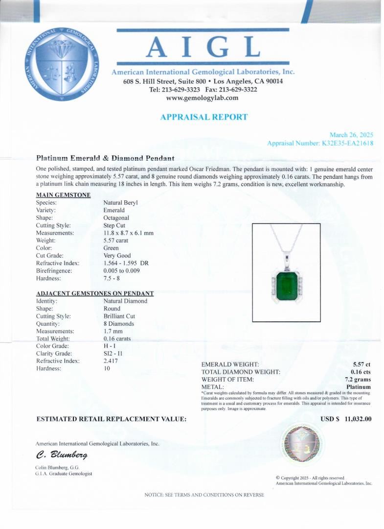 One polished, stamped, and tested platinum pendant marked Oscar Friedman. The pendant is mounted with: 1 genuine emerald center stone weighing approximately 5.57 carat, and 8 genuine round diamonds weighing approximately 0.16 carats. The pendant hangs from a platinum link chain measuring 18 inches in length. This item weighs 7.2 grams, condition is new, excellent workmanship. #MAIN GEMSTONE# Species: Natural Beryl Variety: Emerald Shape: Octagonal Cutting Style: Step Cut Measurements: 11.8 x 8.7 x 6.1mm Weight: 5.57 carat Color: Green Cut Grade: Very Good Refractive Index: 1.564 - 1.595 DR Birefringence: 0.005 to 0.009 Hardness: 7.5 - 8 #ADJACENT GEMSTONES ON PENDANT# Identity: Natural Diamond Shape: Round Cutting Style: Brilliant Cut Quantity: 8 Diamonds Measurements: 1.7mm Total Weight: 0.16 carats Color Grade: H-I Clarity Grade: SI2-I1 Refractive Index: 2.417 Hardness: 10 #EMERALD WEIGHT: 5.57 ct TOTAL DIAMOND WEIGHT: 0.16 cts WEIGHT OF ITEM: 7.2 grams METAL: Platinum Size: 18