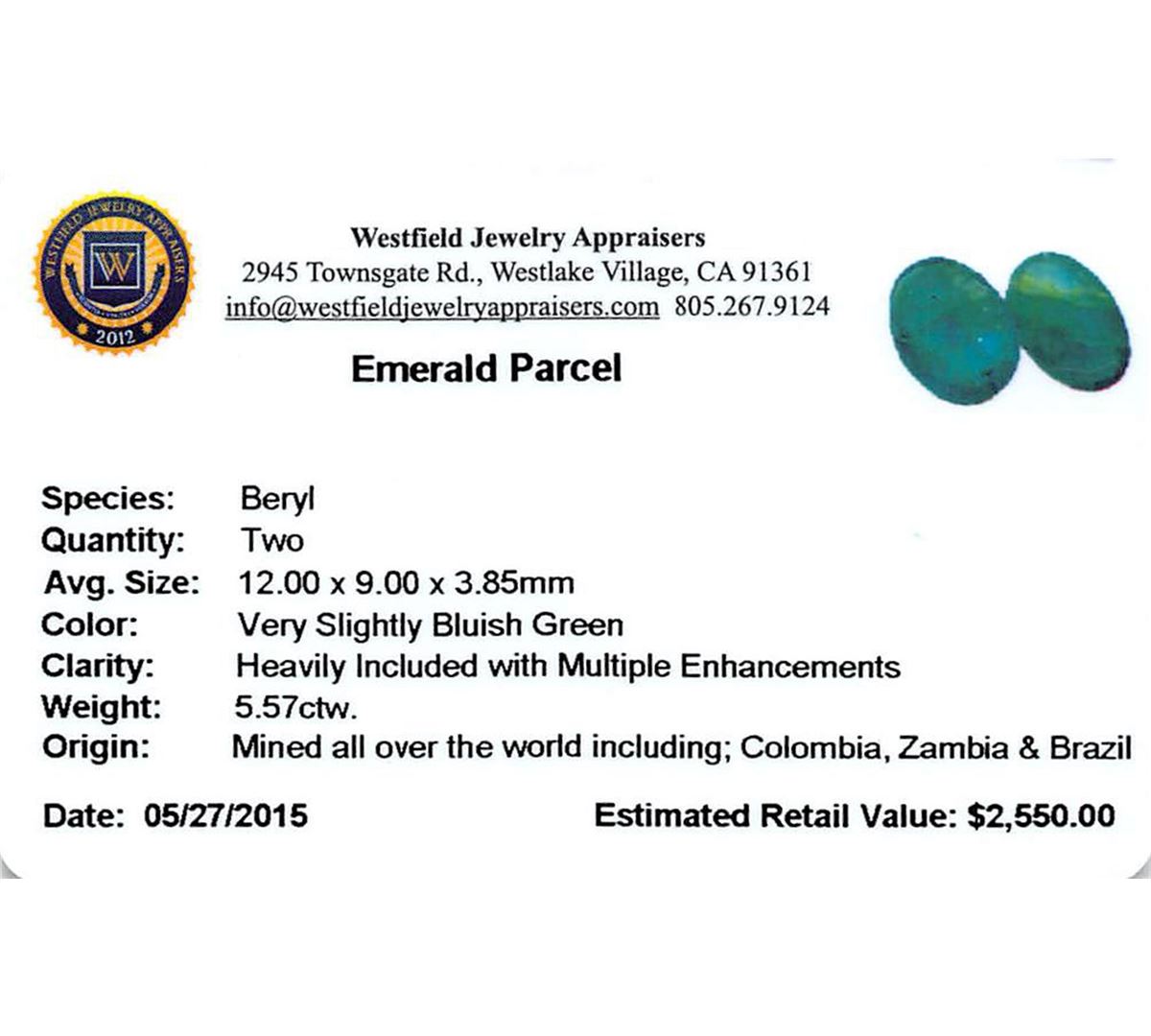 Two oval mixed cut natural emeralds, measuring 12.00 x 9.00 x 3.85mm, exact total weight 5.57ct., clarity is heavily included, type III, medium dark, very slightly grayish, very slightly bluish green color, (GIA vslbG 6/3), cut is good. Transmitting light somewhat diffusely, translucent, Naturally occurring internal & external characteristics are present, Indications of multiple laboratory enhancements, including high temperature heat treatment. Westfield Appraised at $2,550.00.