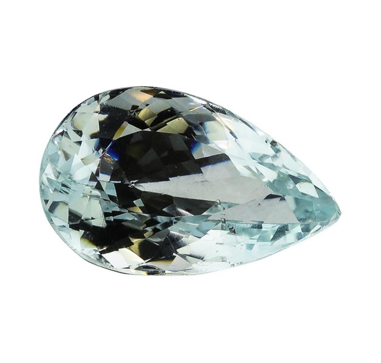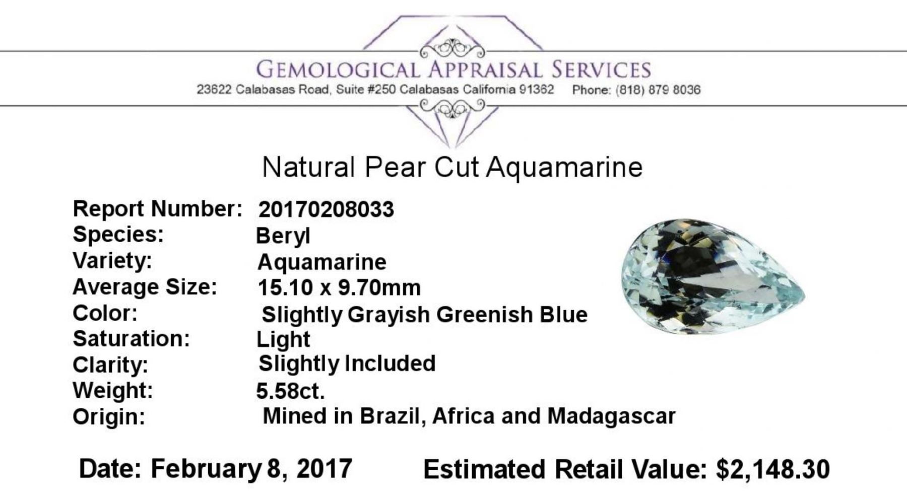 One natural pear cut aquamarine with an exact weight of 5.58ct., clarity is slightly included, slightly grayish greenish blue, light. Gemological Appraisals Services estimates the retail value at $2148.3 GAS Appraised.