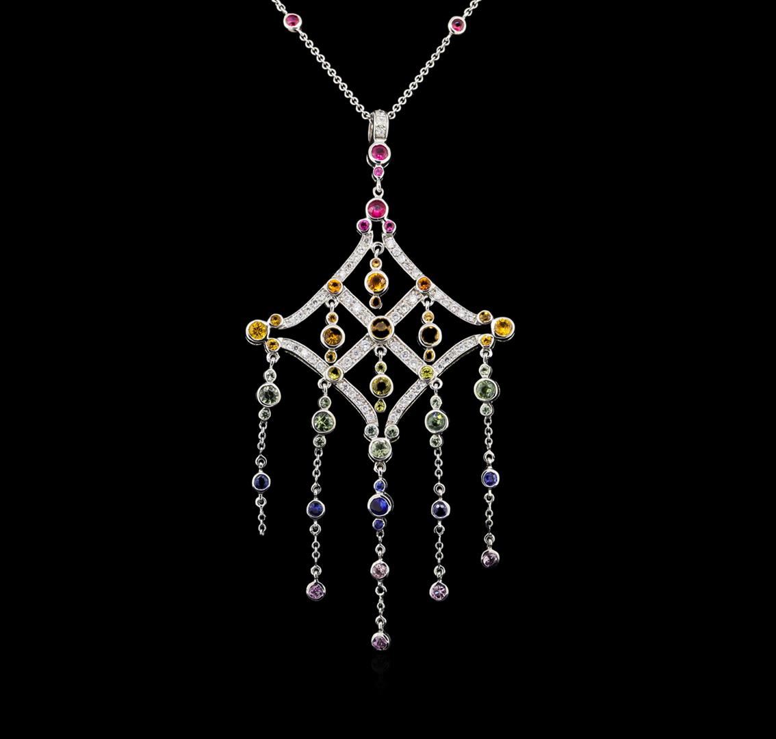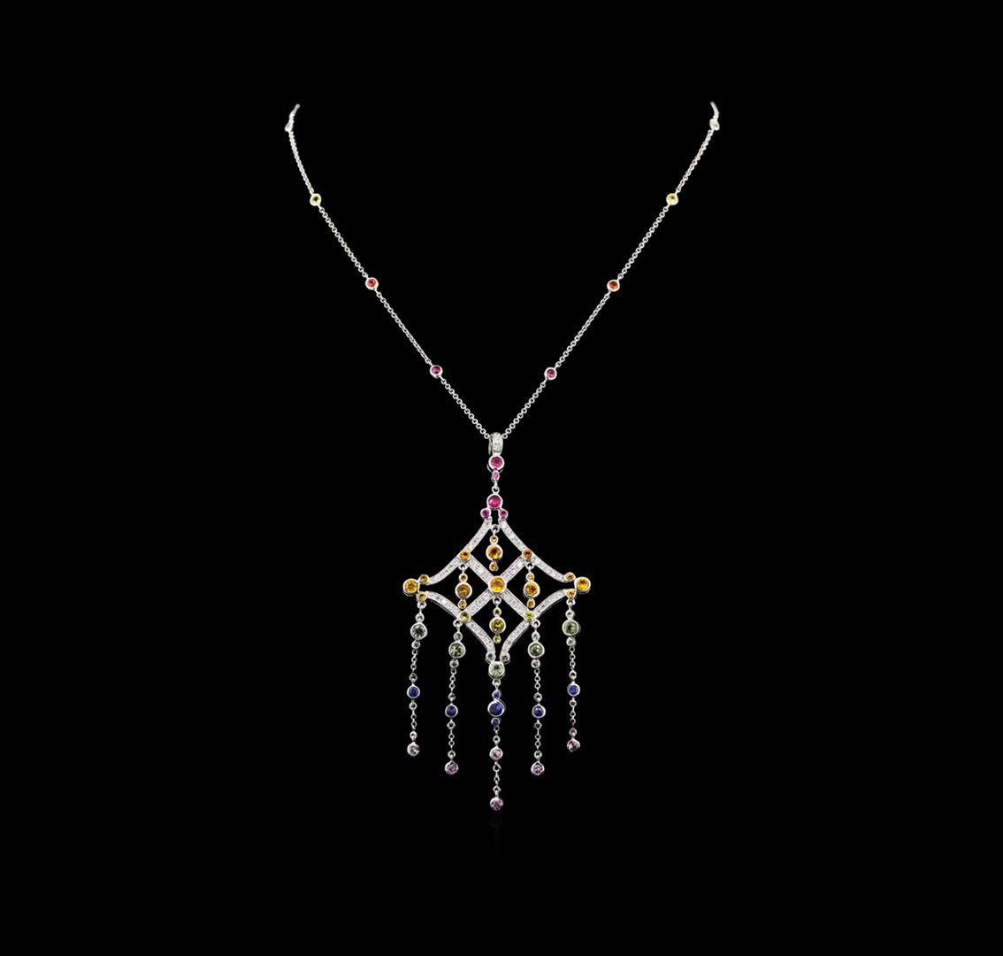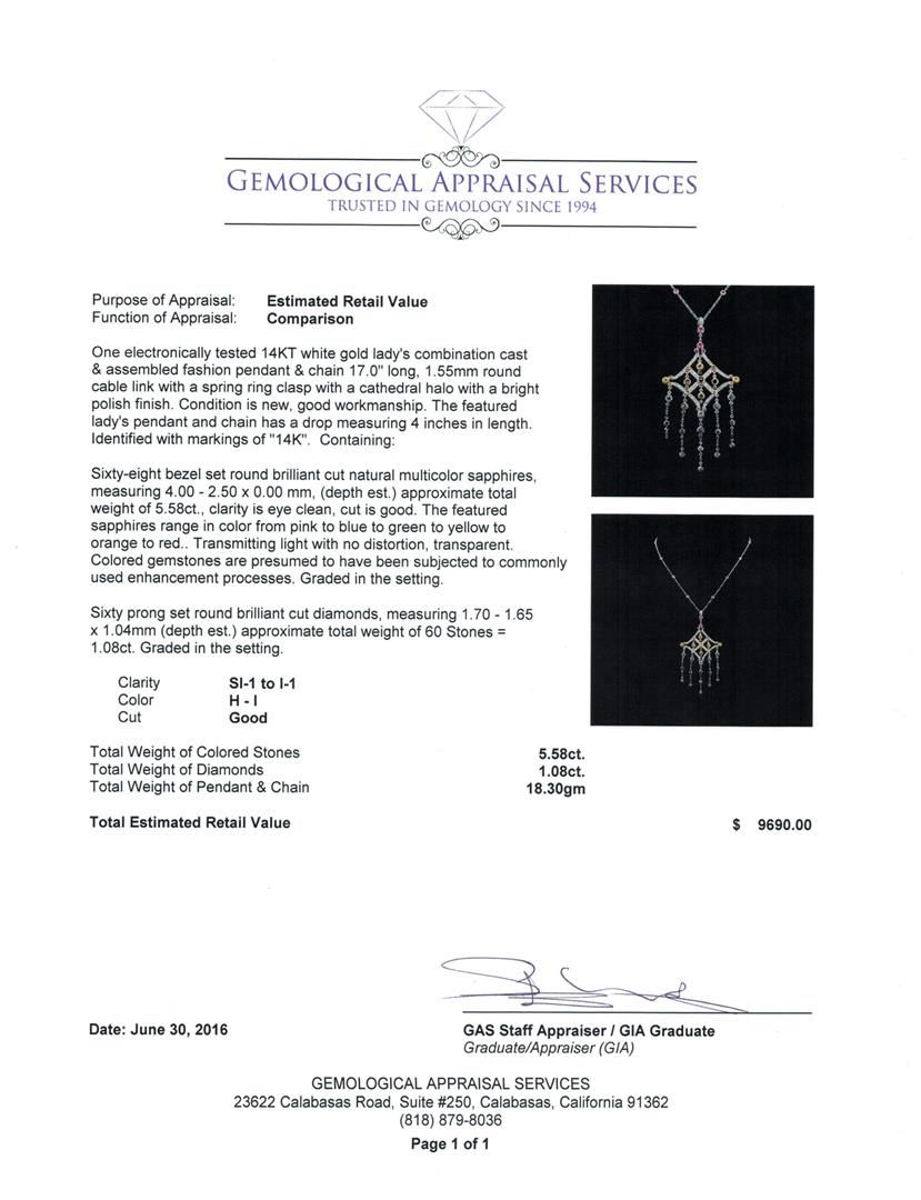 One electronically tested 14KT white gold lady's combination cast & assembled fashion pendant & chain 17.0" long, 1.55mm round cable link with a spring ring clasp with a cathedral halo with a bright polish finish. The featured lady's pendant and chain has a drop measuring 4 inches in length. Identified with markings of "14K". Condition is new, good workmanship. Containing: Sixty-eight bezel set round brilliant cut natural multicolor sapphires, measuring 4.00 - 2.50 x 0.00 mm, (depth est.) approximate total weight of 5.58ct., clarity is eye clean, cut is good. The featured sapphires range in color from pink to blue to green to yellow to orange to red. Transmitting light with no distortion, transparent. Colored gemstones are presumed to have been subjected to commonly used enhancement processes. Graded in the setting. Sixty prong set round brilliant cut diamonds, measuring 1.70 - 1.65 x 1.04mm (depth est.) approximate total weight of 60 Stones = 1.08ct. Graded in the setting. Clarity: SI-1 to I-1. Color: H - I. Cut Good. Total Weight of Colored Stones 5.58ct. Total Weight of Diamonds 1.08ct. Total Weight of Pendant & Chain 18.30gm. GAS Appraised at $9,690.00.