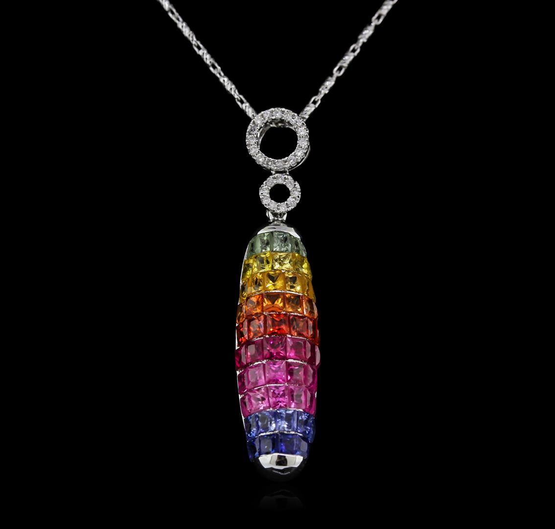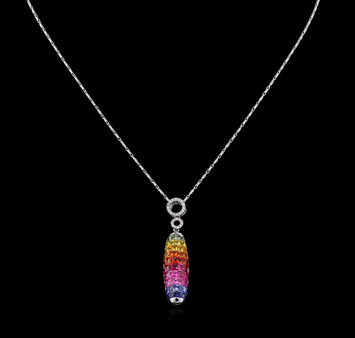 One pendant with chain featuring: 14KT white gold weighing 4.40 grams containing multicolored sapphires with a total weight of 5.58ct and diamonds with a total weight of 0.10ct.