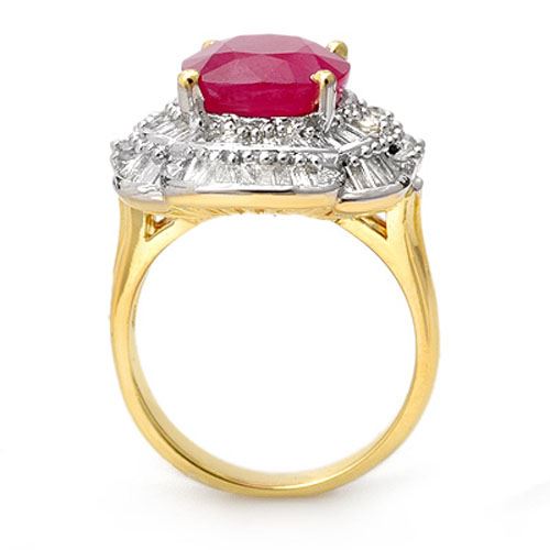 5.59 CTW Ruby & Diamond Ring 14K Yellow Gold ---- Luxury Designer Brand Ring Appraised Retail Price at $12,300 ---- SKU Number US13145 14k Yellow gold Ring Size is 6.5, Ring measuring approx. 3/4" x 3/4" , weighing in total approx. 7.3 grams. Made in the USA and is stamped 14k, Main stone 4.39 carat total weight containing 1 pieces of Mid-Opaque-Deep Red color with AAA quality Oval shape cut Ruby , Stone #2 1.2 carat total weight containing 78 pieces of H-I color with VS/SI quality Round shape cut