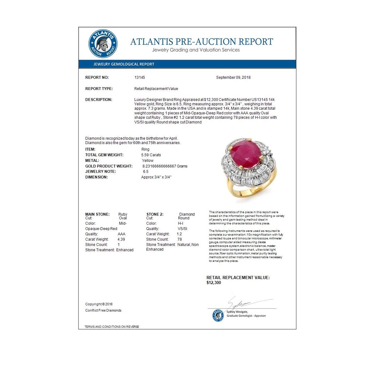 REF-159X6T -13145 ---- 5.59 CTW Ruby & Diamond Ring 14K Yellow Gold ---- Luxury Designer Brand Ring Appraised at $12,300 Certificate Number US13145 14k Yellow gold, Ring Size is 6.5, Ring measuring approx. 3/4" x 3/4" , weighing in total approx. 7.3 grams. Made in the USA and is stamped 14k, Main stone 4.39 carat total weight containing 1 pieces of Mid-Opaque-Deep Red color with AAA quality Oval shape cut Ruby , Stone #2 1.2 carat total weight containing 78 pieces of H-I color with VS/SI quality Round shape cut Diamond