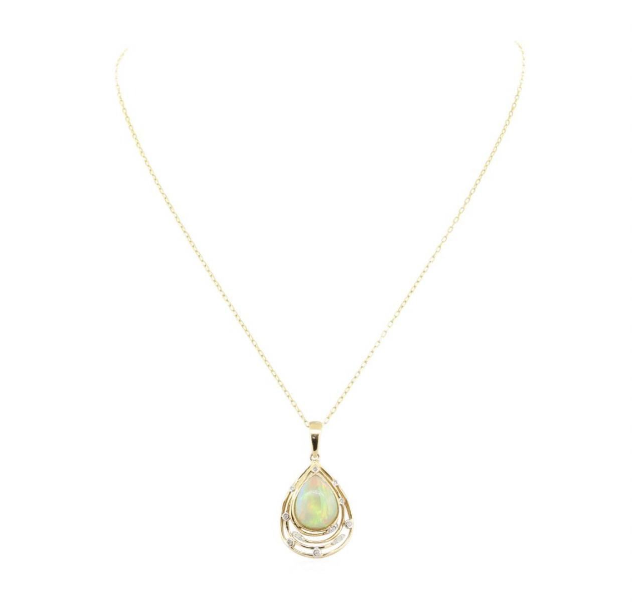 One electronically tested 14KT yellow gold ladies cast & assembled opal and diamond pendant with chain. The pendant features an opal cabochon set within multiple diamond accented bezels, completed by a yellow gold bail. The pendant is supported by an eighteen inch length 14KT yellow gold designer style chain, terminating in a lobster claw clasp. Bright polish finish with rhodium accents. Trademark is Orianne. Identified with markings of "14K". Condition is new, good workmanship. Containing: One bezel set oval cabochon cut natural ethiopian opal approximate weight of 5.59ct. The opal has a somewhat bright, multicolor play of color (fire) in a flashfire pattern; a high dome; a good cut; no inclusions; consistent in its brightness and pattern; and is not directional. Graded in the setting. Seventeen prong & bezel set round brilliant cut diamonds approximate total weight of 17 Stones = 0.16ct. Graded in the setting. Clarity I-1 to I-2 Color H - J Total Weight of Colored Stones 5.59 ct. Total Weight of Diamonds 0.16 ct. Total Weight of Pendant With Chain 8.22 gm Estimated Retail Value $ 3,775.00 US