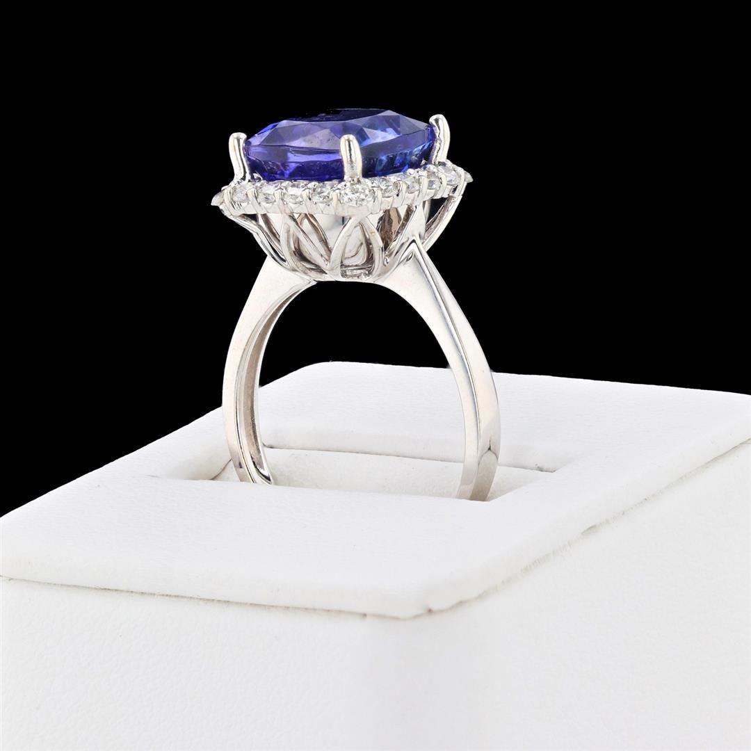 5.59ct Tanzanite and 0.55ctw Diamond 18K White Gold Ring. Please see Photos and Description for all available information. This cushion modified brilliant cut 5.59ct Tanzanite is accented with 20 diamonds with a total weight of 0.55ct, set in an 18K white gold band. The Tanzanite is the birthstone for December. The cushion modified brilliant cut allows the stone to catch and reflect light, giving it a high level of brilliance. The modified brilliant cut is a square modified brilliant cut with a rounded corner. The ring comes in size 6 1/4 and can be resized