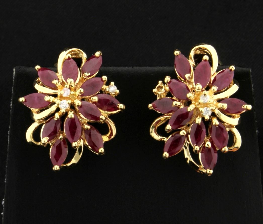 They are 14K yellow gold and contain 5.5cts of rubies that have great deep color & clarity. Also contains four .01ct diamonds. They have safety backs. 7.2g