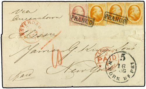 5,6(3) 1866 AMSTERDAM a NEW YORK. 5 cts. rojo y 15 cts. amarillo (3). Roturas en el frente. Cert. N.