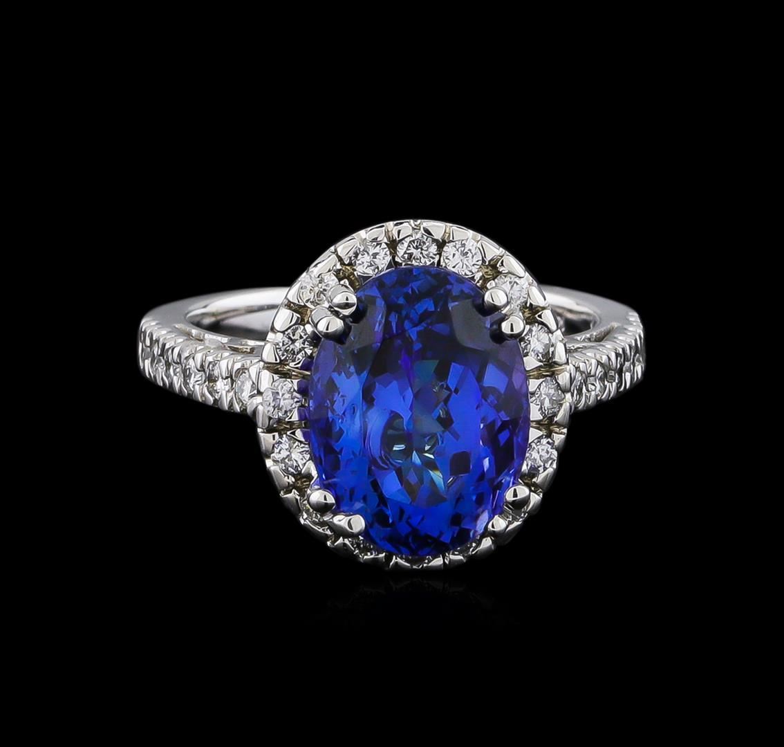One electronically tested 14KT white gold lady's cast fashion ring with a basket halo with a bright polish finish. The featured lady's ring has a shank measuring 2.20 millimeters wide. Identified with markings of "14K". Condition is new, good workmanship. Containing: One prong set oval modified brilliant cut natural tanzanite, measuring 12.02 x 9.11 x 6.83mm, 6%. bulge factor, approximate weight of 5.60ct., clarity is eye clean, type I, medium dark, moderately strong, violetish blue color, (GIA vB 6/4), cut is very good. Transmitting light with no distortion, transparent. Colored gemstones are presumed to have been subjected to commonly used enhancement processes. Graded in the setting. Twenty-Eight prong set round brilliant cut diamonds, measuring 1.70 - 1.65 x 1.04mm (depth est.) approximate total weight of 28 Stones = 0.50ct. Graded in the setting. Clarity: VS-2 to SI-1. Color: H - I. Cut Good. Total Weight of Colored Stones 5.60ct. Total Weight of Diamonds 0.50ct. Total Weight of Ring 6.90gm. GAS Appraised at $11,925.00.